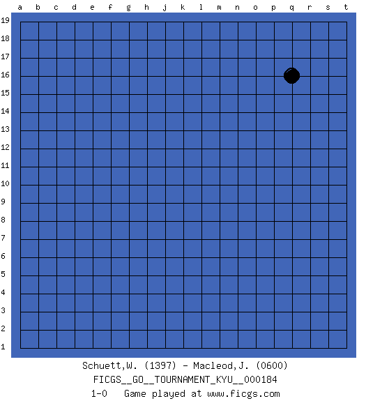 Last move : 1-0 2018 March 24 6:12:19 [Event "FICGS__GO__TOURNAMENT_KYU__000184"] [Site "FICGS"] [Date "2018.02.21"] [Round "1"] [Black "Schuett,Wilhelm"] [White "Macleod,Jermelle"] [Result "1-0"] [Rating 1 "1397"] [Rating 2 "0600"] 1.q16 1-0 This go game has been lost on time (started : 2018.02.21 22:46:58) Here are the names of the openings (joseki) played in the four corners : Player Black won this Go (weiqi, baduk) game. Follow this game move after move (download)Only amateurs try to come up with fancy moves. (Anonymous) Secret operations are essential in war; upon them the army relies to make its every move. (Sun Tzu)