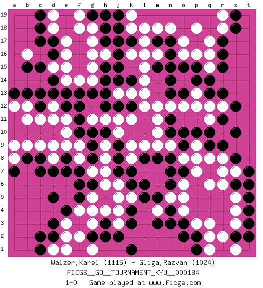 Last move : 1-0 2018 September 3 22:15:53 [Event "FICGS__GO__TOURNAMENT_KYU__000184"] [Site "FICGS"] [Date "2018.02.21"] [Round "1"] [Black "Walzer,Karel"] [White "Gliga,Razvan"] [Result "1-0"] [Rating 1 "1115"] [Rating 2 "1024"] 1.d5 q16 2.d3 q3 3.d16 q6 4.c13 d9 5.c8 c11 6.q14 q12 7.r17 q17 8.r16 r18 9.s18 r19 10.s19 p18 11.r13 r12 12.n17 l16 13.o15 o16 14.n16 o17 15.n14 n18 16.j16 l14 17.k4 g4 18.o3 o4 19.n3 p3 20.h3 e3 21.q10 r10 22.r9 q11 23.p10 o12 24.s10 m12 25.r11 r8 26.s12 q15 27.p14 g16 28.k17 l17 29.h15 g15 30.h13 e17 31.d17 e16 32.d14 e14 33.e13 f14 34.g13 d18 35.c18 d19 36.c19 f18 37.h18 g18 38.f13 k11 39.j9 h11 40.f10 e11 41.f11 d8 42.d7 f8 43.e4 f4 44.f5 g5 45.g2 f2 46.d2 e2 47.g6 j5 48.l6 h7 49.f6 h6 50.g8 h8 51.g9 f9 52.g10 e10 53.e12 d12 54.c12 d11 55.d13 g3 56.h2 j4 57.k3 j3 58.j2 h4 59.k7 k9 60.j8 h9 61.h10 j10 62.l5 g7 63.f7 g11 64.f12 m4 65.m3 j13 66.j14 k13 67.l8 l9 68.m8 p8 69.r15 k18 70.j18 k16 71.j17 k19 72.j19 l18 73.n4 o5 74.o9 n9 75.n10 k5 76.k6 j6 77.m5 n5 78.n8 m9 79.n6 o6 80.o7 p7 81.s8 r7 82.t5 s7 83.t7 s5 84.t4 s3 85.t3 s4 86.s2 r2 87.p2 q2 88.p1 q1 89.o2 o8 90.n7 b16 91.c17 d15 92.c15 e15 93.b15 c9 94.b8 b9 95.c7 b12 96.b13 a12 97.a13 b11 98.h12 s1 99.t2 k8 100.j7 p9 101.o10 m10 102.n11 n12 103.j12 j11 104.k12 l12 105.k14 l13 106.m15 l15 107.m17 m18 108.p15 p16 109.o13 p13 110.q13 p12 111.n13 m16 112.n15 h16 113.h17 g17 114.h14 m11 115.q9 q8 116.e8 e9 117.e7 g1 118.k1 d1 119.c1 e1 120.c2 a8 121.a7 a9 122.s6 r6 123.t6 h19 124.g19 f19 125.j15 g14 126.h19 1-0 Here are the names of the openings (joseki) played in the four corners : Corner q16 : q16 q14 Hoshi (Hwajeom, Seongjeom, Xingwei`) 4-4 Point. The star or hoshi (4-4) point, emphasizing influence at the potential expense of territory. Ikken Takagakari (Hankan Nop'dakeolch'im, Yi Gaojia, 1-Space High Approach). White typically responds at 6-4 or 3-10. White 4-10 is played when White finds play on the right side advantageous. White 4-8 or 3-8 may be played when White has support at top. Player Black won this Go (weiqi, baduk) game. Follow this game move after move (download)Don't make territory near thickness. (Anonymous) Hardware: the parts of a computer that can be kicked. (Jeff Persis)