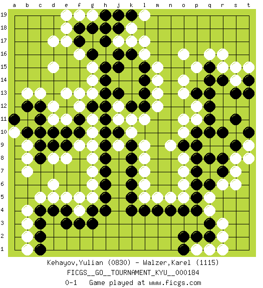 Last move : 0-1 2018 April 4 21:58:50 [Event "FICGS__GO__TOURNAMENT_KYU__000184"] [Site "FICGS"] [Date "2018.02.21"] [Round "1"] [Black "Kehayov,Yulian"] [White "Walzer,Karel"] [Result "0-1"] [Rating 1 "0830"] [Rating 2 "1115"] 1.d4 q16 2.q3 d17 3.r10 q5 4.c10 c13 5.q14 o16 6.k4 d6 7.e3 c5 8.c8 e8 9.e9 d8 10.d9 b3 11.c3 b4 12.c2 b7 13.p5 q4 14.p4 r3 15.q2 r2 16.q6 r6 17.r7 q7 18.p6 s6 19.r8 k17 20.k16 j17 21.j16 h16 22.j15 k10 23.j10 j9 24.k9 l9 25.k8 j11 26.h10 l11 27.h8 o13 28.q13 o10 29.q10 o7 30.p7 s8 31.s9 s7 32.q8 r15 33.r14 l16 34.h14 d15 35.h11 j12 36.h12 g13 37.h13 g14 38.h15 g15 39.l15 m14 40.l14 m15 41.l13 m12 42.j13 l8 43.k7 n5 44.n4 m5 45.m4 l7 46.k6 g5 47.g3 g7 48.h7 g9 49.h9 f9 50.f10 g10 51.f11 g11 52.c12 b13 53.g12 f12 54.e12 f13 55.b12 a10 56.a11 b9 57.b10 b8 58.c9 e11 59.e10 d11 60.c11 d12 61.d10 e13 62.h4 g8 63.h5 e5 64.g4 g6 65.h6 o8 66.p9 p11 67.q11 p12 68.q12 p15 69.q15 r16 70.o9 n9 71.p8 o6 72.o4 l5 73.l4 q1 74.p2 p1 75.o1 r1 76.o2 t9 77.t10 t8 78.s11 s14 79.s13 t15 80.t13 f4 81.f3 b2 82.c1 b1 83.c4 d5 84.e4 f5 85.k12 k11 86.l12 m13 87.t14 s15 88.p13 o14 89.p10 o11 90.h17 l17 91.g16 f16 92.f17 e17 93.f18 e18 94.j18 k18 95.j19 f19 96.g18 g19 97.h19 e19 98.k19 l19 99.h18 l6 100.k5 o5 0-1 Here are the names of the openings (joseki) played in the four corners : Corner q4 : q3 q5 Komoku (Somok, Xiao~mu`) 3-4 Point. The komoku (3-4) point is the traditional corner enclosure move.. Ikken Takagakari (Hankan Nop'dakeolch'im, Yi Gaogua`jiao~, 1-Space High Approach). The 5-4 approach move has become more popular in modern times, as modern Go emphasizes speed and influence. Corner q16 : q16 q14 Hoshi (Hwajeom, Seongjeom, Xingwei`) 4-4 Point. The star or hoshi (4-4) point, emphasizing influence at the potential expense of territory. Ikken Takagakari (Hankan Nop'dakeolch'im, Yi Gaojia, 1-Space High Approach). White typically responds at 6-4 or 3-10. White 4-10 is played when White finds play on the right side advantageous. White 4-8 or 3-8 may be played when White has support at top. Corner d4 : d4 d6 Hoshi (Hwajeom, Seongjeom, Xingwei`) 4-4 Point. The star or hoshi (4-4) point, emphasizing influence at the potential expense of territory. Ikken Takagakari (Hankan Nop'dakeolch'im, Yi Gaojia, 1-Space High Approach). Black typically responds at 6-4 or 3-10. Black 4-10 is played when Black finds play on the right side advantageous. Black 4-8 or 3-8 may be played when Black has support at top. Player White won this Go (weiqi, baduk) game. Follow this game move after move (download)There are possible things, impossible things, and things that happen. Sometimes things happen that were impossible. (Pierre Audouard) Coffee just isn't my cup of tea. (Unknown)