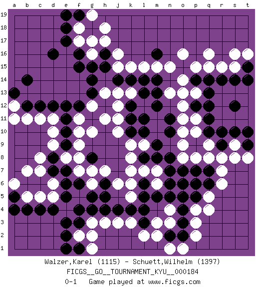 Last move : 0-1 2018 October 15 13:6:7 [Event "FICGS__GO__TOURNAMENT_KYU__000184"] [Site "FICGS"] [Date "2018.02.21"] [Round "1"] [Black "Walzer,Karel"] [White "Schuett,Wilhelm"] [Result "0-1"] [Rating 1 "1115"] [Rating 2 "1397"] 1.c4 q4 2.d16 q16 3.e3 d10 4.d12 d6 5.h4 k3 6.o4 p3 7.o3 h3 8.g4 m2 9.n2 m3 10.m5 f2 11.e2 k5 12.p5 q5 13.q6 g3 14.f4 p2 15.q14 r15 16.r14 f17 17.f16 h17 18.h16 g16 19.f15 j16 20.h15 o16 21.q10 q8 22.p7 r6 23.q7 r7 24.r9 p8 25.o7 r8 26.m8 k7 27.n10 k9 28.l10 c11 29.c12 p10 30.q11 o11 31.m12 j15 32.g14 j13 33.n11 o8 34.n8 o13 35.p12 o12 36.l14 m7 37.n7 m6 38.n6 p4 39.m16 l15 40.m14 m15 41.k12 k13 42.l13 o5 43.p6 n4 44.k10 j12 45.l11 p13 46.q13 p11 47.q12 j11 48.k11 l9 49.m9 n15 50.n5 n13 51.m13 c5 52.d4 j10 53.g8 g6 54.g11 g10 55.e17 f18 56.e18 f11 57.f12 g12 58.e11 f10 59.g13 h11 60.f6 f7 61.e6 g7 62.e7 e8 63.d7 c7 64.d8 c8 65.e9 f8 66.j4 j3 67.k4 b5 68.b4 d9 69.e10 f9 70.h6 j6 71.h5 h7 72.l4 d11 73.e12 s15 74.s14 b11 75.b12 d5 76.e5 a12 77.a13 a11 78.b14 n3 79.o2 o1 80.o6 n1 81.o5 s9 82.s10 q9 83.r10 s8 84.s12 q15 85.p14 p15 86.k14 k15 87.j14 h13 88.l3 l2 89.l6 l7 90.l5 k6 91.l8 k8 92.t15 t16 93.t14 s16 94.f19 g19 95.e19 h18 96.g15 g17 97.a5 a6 98.a4 b7 99.f1 g1 100.e1 o9 101.t9 t8 102.t10 o14 103.f3 g2 104.g5 o10 0-1 Here are the names of the openings (joseki) played in the four corners : Corner q4 : q4 o4 Hoshi (Hwajeom, Seongjeom, Xingwei`) 4-4 Point. The star or hoshi (4-4) point, emphasizing influence at the potential expense of territory. Ikken Takagakari (Hankan Nop'dakeolch'im, Yi Gaojia, 1-Space High Approach). White typically responds at 6-4 or 3-10. White 4-10 is played when White finds play on the right side advantageous. White 4-8 or 3-8 may be played when White has support at top. Corner q16 : q16 q14 Hoshi (Hwajeom, Seongjeom, Xingwei`) 4-4 Point. The star or hoshi (4-4) point, emphasizing influence at the potential expense of territory. Ikken Takagakari (Hankan Nop'dakeolch'im, Yi Gaojia, 1-Space High Approach). White typically responds at 6-4 or 3-10. White 4-10 is played when White finds play on the right side advantageous. White 4-8 or 3-8 may be played when White has support at top. Player White won this Go (weiqi, baduk) game. Follow this game move after move (download)Beginner's games are surprising, often incoherent and incomprehensible. When you improve, your game gains in consistency but flirts with stupidity: you become satisfied with truisms and mechanical movements, you try to obtain a feeling for clearness and style the easy way. (Pierre Audouard) Life is like internet, nothing interesting, but noone want to leave it. (Ilmars Cirulis)