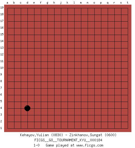 Last move : 1-0 2018 March 24 18:11:27 [Event "FICGS__GO__TOURNAMENT_KYU__000184"] [Site "FICGS"] [Date "2018.02.21"] [Round "1"] [Black "Kehayov,Yulian"] [White "Zinkhanov,Sungat"] [Result "1-0"] [Rating 1 "0830"] [Rating 2 "0600"] 1.d4 1-0 This go game has been lost on time (started : 2018.02.21 22:46:58) Here are the names of the openings (joseki) played in the four corners : Corner d4 : d4 1-0 Hoshi (Hwajeom, Seongjeom, Xingwei`) 4-4 Point. The star or hoshi (4-4) point, emphasizing influence at the potential expense of territory. Player Black won this Go (weiqi, baduk) game. Follow this game move after move (download)In the corner, five stones in a row on the third line are alive. (Anonymous) It's not the will to win, but the will to prepare to win that makes the difference. (Bear Bryant)