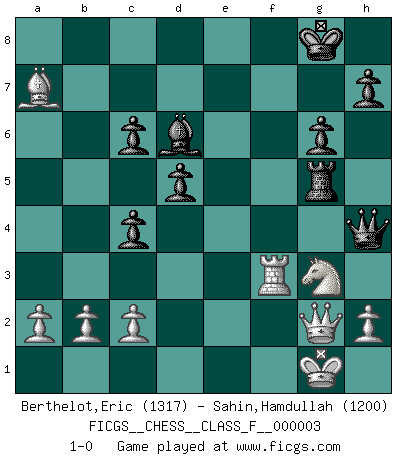 Last move : 1-0 2006 September 15 13:6:46 [Event "FICGS__CHESS__CLASS_F__000003"] [Site "FICGS"] [Date "2006.06.01"] [Round "1"] [White "Berthelot,Eric"] [Black "Sahin,Hamdullah"] [Result "1-0"] [WhiteElo "1317"] [BlackElo "1200"] 1.e4 e6 2.d4 d5 3.Nc3 c5 4.exd5 exd5 5.Nf3 Be6 6.Bb5+ Nc6 7.Ne5 Nge7 8.Nxc6 Nxc6 9.Bxc6+ bxc6 10.Be3 c4 11.O-O Bd6 12.f4 O-O 13.f5 Qh4 14.g3 Bxg3 15.Qe2 Bd6 16.fxe6 fxe6 17.Qg2 Rxf1+ 18.Rxf1 e5 19.Ne2 Re8 20.Ng3 g6 21.Qf3 Rf8 22.Qg2 Re8 23.dxe5 Rxe5 24.Bxa7 Rg5 25.Rf3 1-0 French : Marshall variation Kingside Castling by player White (move 11) Kingside Castling by player Black (move 12) Player White won this chess game. Follow this game move after move (download)Good offense and good defense both begin with good development. (Bruce A. Moon) Im Fernschach kannst du während dem Spiel rauchen. (John Christen Knudsen) Diferente gente reacciona diferentemente en aceptar la derrota. (Bobby Fischer) Les réformistes prétendent que les progrès de la théorie conduiront à la disparition des échecs, et qu'il faut, pour leur rendre vie, en remanier les règles. En réalité, qu'exprime cette affirmation? Le mépris de l'intuition, de l'imagination et de tous les autres éléments qui font des échecs un art. (Alexander Alekhine) May the force be with you. (Han Solo in Star Wars ep.4)