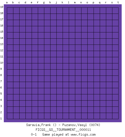 Last move : 0-1 2018 April 14 20:57:48 [Event "FICGS__GO__TOURNAMENT__000011"] [Site "FICGS"] [Date "2018.03.15"] [Round "1"] [Black "Saravia,Frank"] [White "Puzanov,Vasyl"] [Result "0-1"] [Rating 2 "0074"] 0-1 This go game has been lost on time (started : 2018.03.15 19:13:38) Here are the names of the openings (joseki) played in the four corners : Player White won this Go (weiqi, baduk) game. Follow this game move after move (download)For rectangular six in the corner, dame is necessary. (Anonymous) There will be no order, only chaos. (Sol Robeson in Pi by Darren Aronofsky)