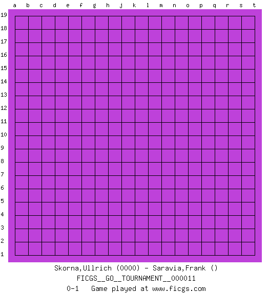 Last move : 0-1 2018 April 14 20:57:48 [Event "FICGS__GO__TOURNAMENT__000011"] [Site "FICGS"] [Date "2018.03.15"] [Round "1"] [Black "Skorna,Ullrich"] [White "Saravia,Frank"] [Result "0-1"] [Rating 1 "0000"] 0-1 This go game has been lost on time (started : 2018.03.15 19:13:38) Here are the names of the openings (joseki) played in the four corners : Player White won this Go (weiqi, baduk) game. Follow this game move after move (download)If White takes all four corners, Black should resign; if Black takes all four corners, Black should also resign. (David Kent) SEO proverb : Make your website optimized for human beings, not for search engines.