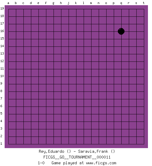 Last move : 1-0 2018 April 15 21:3:39 [Event "FICGS__GO__TOURNAMENT__000011"] [Site "FICGS"] [Date "2018.03.15"] [Round "1"] [Black "Rey,Eduardo"] [White "Saravia,Frank"] [Result "1-0"] 1.q16 1-0 This go game has been lost on time (started : 2018.03.15 19:13:38) Here are the names of the openings (joseki) played in the four corners : Player Black won this Go (weiqi, baduk) game. Follow this game move after move (download)White is always trying to kill a bigger group than black is trying to save. (Anonymous) The only thing that overcomes hard luck is hard work. (Harry Golden)