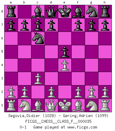 Last move : 0-1 2007 June 4 18:16:34 [Event "FICGS__CHESS__CLASS_F__000035"] [Site "FICGS"] [Date "2007.04.24"] [Round "1"] [White "Segovia,Didier"] [Black "Gering,Adrien"] [Result "0-1"] [WhiteElo "1028"] [BlackElo "1099"] 1.e4 e5 2.c3 Nc6 0-1 This chess game has been lost on time (started : 2007.04.24 1:55:45) Variation Lopez Opening : Lopez Opening Player Black won this chess game. Follow this game move after move (download)A passed Pawn increases in strength as the number of pieces on the board diminishes. (Capablanca) Herr Iljumschinow ist ein etwas merkwürdiger Geschäftsmann: Er arbeitet zusammen mit Leuten wie Muammar al-Gaddafi; früher ist das Saddam Hussein gewesen. (Joel Lautier) El Jaque al descubierto es el bombardero del tablero. (Reuben Fine) On est toujours la mazette de quelqu'un d'autre. (Anonyme) Is not life a hundred times too short to bore ourselves ? (Friedrich Nietzsche)