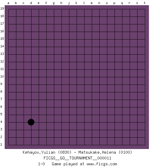 Last move : 1-0 2018 March 24 18:11:27 [Event "FICGS__GO__TOURNAMENT__000011"] [Site "FICGS"] [Date "2018.02.22"] [Round "1"] [Black "Kehayov,Yulian"] [White "Matsukake,Helena"] [Result "1-0"] [Rating 1 "0830"] [Rating 2 "0100"] 1.d4 1-0 This go game has been lost on time (started : 2018.02.22 4:37:19) Here are the names of the openings (joseki) played in the four corners : Corner d4 : d4 1-0 Hoshi (Hwajeom, Seongjeom, Xingwei`) 4-4 Point. The star or hoshi (4-4) point, emphasizing influence at the potential expense of territory. Player Black won this Go (weiqi, baduk) game. Follow this game move after move (download)When in doubt, remove the enemy stones from the board. (Bill Taylor) Perception is reality. (Immanuel Kant)
