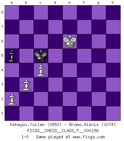 Last move : 1-0 2018 March 9 16:21:17 [Event "FICGS__CHESS__CLASS_F__000196"] [Site "FICGS"] [Date "2018.02.23"] [Round "1"] [White "Kehayov,Yulian"] [Black "Bromo,Alexis"] [Result "1-0"] [WhiteElo "0850"] [BlackElo "1074"] 1.e4 e5 2.d3 h6 3.Nf3 Nc6 4.Be2 Nf6 5.O-O Bc5 6.h3 d6 7.c4 Be6 8.b3 O-O 9.Ba3 Bxa3 10.Nxa3 a6 11.Qd2 Qd7 12.g4 Nh7 13.Nh2 Nd4 14.Nc2 Nxc2 15.Qxc2 c5 16.Qd2 Ng5 17.h4 Nh3+ 18.Kg2 Nf4+ 19.Kg1 Nxe2+ 20.Qxe2 g6 21.f3 b5 22.Rfd1 b4 23.Kh1 h5 24.g5 f6 25.Qg2 fxg5 26.Qxg5 Kf7 27.Rg1 Rg8 28.Raf1 Raf8 29.f4 Ke8 30.fxe5 dxe5 31.Rxf8+ Kxf8 32.Qf6+ Bf7 33.Qxe5 Qe6 34.Qxc5+ Kg7 35.Qxb4 Rd8 36.Qc3+ Kh7 37.d4 Qxe4+ 38.Rg2 Rxd4 39.Qf3 Be6 40.Qxe4 Rxe4 41.Kg1 Bh3 42.Rd2 Rxh4 43.Nf3 Rf4 44.Ng5+ Kh6 45.Nxh3 Rg4+ 46.Rg2 Rxg2+ 47.Kxg2 g5 48.Nxg5 Kxg5 49.Kg3 Kf5 50.Kh4 Ke5 51.Kxh5 Kd4 52.Kg5 Kc5 53.Kf5 a5 54.Ke6 1-0 Variation Indian Opening : Indian Opening Kingside Castling by player White (move 5) Kingside Castling by player Black (move 8) 10 pieces endgame at move 46 : White KNPPP , Black KRPPP WHITE : King + 1 Knight 3 Pawns BLACK : King + 1 Rook 3 Pawns 9 pieces endgame at move 47 : White KNPPP , Black KPPP WHITE : King + 1 Knight 3 Pawns BLACK : King + 3 Pawns 8 pieces endgame at move 48 : White KNPPP , Black KPP WHITE : King + 1 Knight 3 Pawns BLACK : King + 2 Pawns 7 pieces endgame at move 48 : White KPPP , Black KPP WHITE : King + 3 Pawns BLACK : King + 2 Pawns 6 pieces endgame at move 51 : White KPPP , Black KP WHITE : King + 3 Pawns BLACK : King + 1 Pawn Player White won this chess game. Follow this game move after move (download)Not all artists are Chess players, but all Chess players are artists. (Marcel Duchamp) Ich möchte Schüler heranbilden, die das Vermögen haben, selbst zu denken und Kritik zu üben. (Emanuel Lasker) El Rey es una pieza de pelea. ¡Usenlo!. (Wilhelm Steinitz) Roi des jeux et jeu des rois, les échecs portent en eux un sentiment d'infini. Ils donnent à celui qui s'est efforcé d'en approfondir les arcanes l'impression de n'être pas à la mesure de l'homme; en fait, ils constituent un résumé de l'univers, un microcosme, et figurent cette grande échelle qui, dans les plans de la lumière descend jusqu'à la matière, qui des abîmes insondables remonte jusqu'en l'infini de Dieu. (Pyrame) Wipe them out. All of them. (Darth Sidious in Star Wars ep.1)