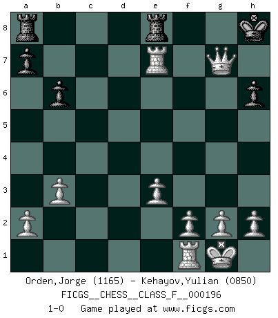 Last move : 1-0 2018 March 30 22:35:53 [Event "FICGS__CHESS__CLASS_F__000196"] [Site "FICGS"] [Date "2018.02.23"] [Round "1"] [White "Orden,Jorge"] [Black "Kehayov,Yulian"] [Result "1-0"] [WhiteElo "1165"] [BlackElo "0850"] 1.d4 d5 2.Nf3 e6 3.e3 Nf6 4.Be2 Be7 5.O-O O-O 6.b3 Qd7 7.Bb2 c5 8.Ne5 Qc7 9.dxc5 Qxc5 10.c4 dxc4 11.Bxc4 Nc6 12.Ba3 Qxe5 13.Nd2 Ne4 14.Bxe7 Nxe7 15.Nxe4 Qxe4 16.Bd3 Qc6 17.Rc1 Qb6 18.Qe2 Qc7 19.Rxc7 b6 20.Rxe7 e5 21.Rxe5 Be6 22.Bc4 Bxc4 23.Qxc4 h6 24.Re7 Rfe8 25.Qxf7+ Kh8 26.Qxg7+ 1-0 Queen's pawn game Kingside Castling by player White (move 5) Kingside Castling by player Black (move 5) Player White won this chess game. Follow this game move after move (download)If I win a tournament, I win it by myself. I do the playing. Nobody helps me. (Bobby Fischer) Ich brauche nur einen Blick auf das Schachbrett zu werfen, und weiß schon, was in der Stellung steckt, was geschehen kann und was geschehen wird. Alle übrigen suchen und prüfen, ich aber weiß es! (José Raúl Capablanca) El Ajedrez demanda una total concentración. (Bobby Fischer) Les pièces de l'échiquier étaient impitoyables. Elles le retenaient, elles l'absorbaient. Il y avait de l'horreur en cela, mais aussi une harmonie unique. Car, qu'y a-t-il dans le monde, à part les échecs ? (V. Nabokov) Perhaps chess is the wrong game for the times (The Chess Master and the Computer, by Garry Kasparov - 2010)