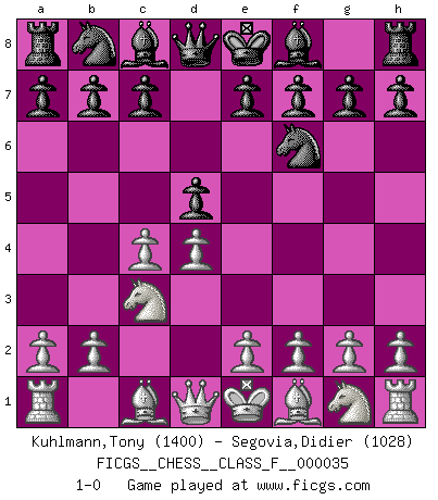 Last move : 1-0 2007 June 4 18:16:34 [Event "FICGS__CHESS__CLASS_F__000035"] [Site "FICGS"] [Date "2007.04.24"] [Round "1"] [White "Kuhlmann,Tony"] [Black "Segovia,Didier"] [Result "1-0"] [WhiteElo "1400"] [BlackElo "1028"] 1.d4 d5 2.c4 Nf6 3.Nc3 1-0 This chess game has been lost on time (started : 2007.04.24 1:55:45) QGD : Marshall defense Player White won this chess game. Follow this game move after move (download)Adequate compensation for a sacrifice is having a sound combination leading to a winning position; adequate compensation for a blunder is having your opponent snatch defeat from the jaws of victory. (Bruce A. Moon) Die Arbeit ist etwas Unnatürliches. Die Faulheit allein ist göttlich. (Anatole France) No hay precio que no valga la pena por la cabellera del Rey enemigo. (Koblentz) Les pièces de l'échiquier étaient impitoyables. Elles le retenaient, elles l'absorbaient. Il y avait de l'horreur en cela, mais aussi une harmonie unique. Car, qu'y a-t-il dans le monde, à part les échecs ? (V. Nabokov) Life is the sum of all your choices. (Albert Camus)