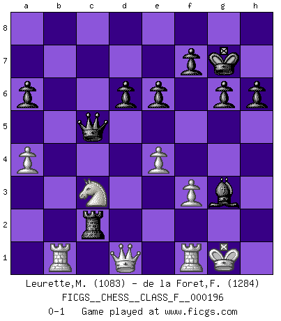 Last move : 0-1 2018 March 29 19:17:54 [Event "FICGS__CHESS__CLASS_F__000196"] [Site "FICGS"] [Date "2018.02.23"] [Round "1"] [White "Leurette,Marc-Antoine"] [Black "de la Foret,Fred"] [Result "0-1"] [WhiteElo "1083"] [BlackElo "1284"] 1.e4 c5 2.d4 cxd4 3.c3 dxc3 4.Nxc3 Nc6 5.Nf3 d6 6.Be2 g6 7.O-O Bg7 8.Qc2 Nf6 9.Bb5 O-O 10.Bg5 Bg4 11.Qd3 h6 12.Bxf6 Bxf6 13.h3 Bxf3 14.Qxf3 Nd4 15.Qd3 e6 16.Rab1 a6 17.Bc4 b5 18.Bb3 Qb6 19.Ne2 Nxb3 20.Qxb3 Rac8 21.g3 Rc4 22.Qf3 Kg7 23.b3 Rc2 24.a4 Rfc8 25.h4 bxa4 26.bxa4 Qa5 27.Nf4 R8c3 28.Qd1 Qe5 29.f3 Bxh4 30.Ne2 Bxg3 31.Nxc3 Qc5+ 0-1 Sicilian : Smith-Morra gambit Kingside Castling by player White (move 7) Kingside Castling by player Black (move 9) Player Black won this chess game. Follow this game move after move (download)I still hope to kill Fischer. (Boris Spassky) Über die Verhaftung Bobby Fischers: Warum es die Bush-Administration für nötig befindet einen 61 Jahre alten Mann zu hetzten, der für niemanden ausser sich selbste eine Gefahr darstellt ist ein Rätsel. (Nigel Short) En la vida, como en el Ajedrez, los Peones propios obstruyen nuestro camino. La gran fortuna de un hombre, su comodidad, placer, hijos, libros, que deberían ayudarle a ganar, con mucha frecuencia lo ponen en Jaque Mate. (Charles Buxton) Même si l'adversaire joue le coup analysé précédemment, recommencez l'analyse en voyant la nouvelle position. Première règle de Blumenfeld However beautiful the strategy, you should occasionally look at the results. (Winston Churchill)