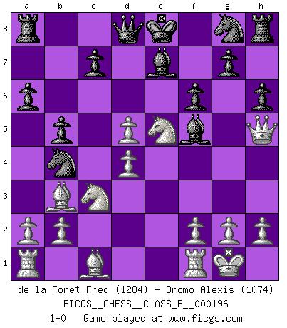 Last move : 1-0 2018 February 23 16:50:17 [Event "FICGS__CHESS__CLASS_F__000196"] [Site "FICGS"] [Date "2018.02.23"] [Round "1"] [White "de la Foret,Fred"] [Black "Bromo,Alexis"] [Result "1-0"] [WhiteElo "1284"] [BlackElo "1074"] 1.d4 d5 2.c4 e6 3.Nf3 h6 4.Nc3 a6 5.e4 Nc6 6.cxd5 exd5 7.exd5 Nb4 8.Bc4 b5 9.Bb3 Bf5 10.O-O Be7 11.Ne5 f6 12.Qh5+ 1-0 Queen's gambit declined Kingside Castling by player White (move 10) Player White won this chess game. Follow this game move after move (download)On the chessboard, lies and hypocrisy do not survive long. (Emanuel Lasker) Ein Remis kann durch Wiederholung von drei Zügen oder durch einen schlechte Zug erreicht werden. (Savielly Grigorievitsch Tartakower) El estómago es una parte esencial del maestro de Ajedrez. (Bent Larsen) Il vaut mieux sacrifier les pièces de l'adversaire. (Xavier Tartacover) The obstacle is the path. (Zen proverb)