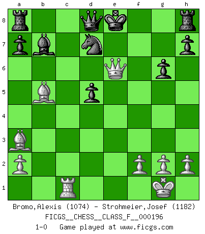 Last move : 1-0 2018 March 22 8:32:14 [Event "FICGS__CHESS__CLASS_F__000196"] [Site "FICGS"] [Date "2018.02.23"] [Round "1"] [White "Bromo,Alexis"] [Black "Strohmeier,Josef"] [Result "1-0"] [WhiteElo "1074"] [BlackElo "1182"] 1.e4 c5 2.Nf3 Nc6 3.d4 cxd4 4.Nxd4 Nf6 5.Nc3 e6 6.Bc4 Bb4 7.Nxc6 bxc6 8.O-O Bxc3 9.bxc3 d6 10.Ba3 Nxe4 11.Re1 d5 12.Bd3 Nxc3 13.Qf3 Na4 14.c4 Nb6 15.cxd5 cxd5 16.Rac1 Bb7 17.Bb5+ Nd7 18.Qg4 g6 19.Rxe6+ fxe6 20.Qxe6+ 1-0 Sicilian defense Kingside Castling by player White (move 8) Player White won this chess game. Follow this game move after move (download)The only thing Chess players have in common is Chess. (Lodewijk Prins) Frage: Wie viele Autos haben Sie schon zerstört? - Antwort: Nur zwei. (Loek van Wely) Los problemas de Ajedrez exigen del compositor las mismas virtudes que caracterizan todo el arte de valor: originalidad, invención, concisión, armonía, complejidad e insinceridad explendida. (Vladimir Nabokov) Je ne suis pas le dernier à jouer lâchement des coups douteux pendant le zeïtnot de l'adversaire pour l'achever: en effet les coups qui font le plus peur sont ceux que l'on ne comprend pas. Je me fais souvent peur quand je joue. (Un professeur anonyme) The difference between stupidity and genius is that genius has its limits. (Murphy)