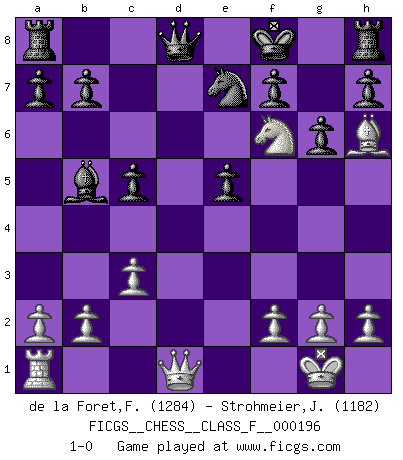 Last move : 1-0 2018 March 28 5:38:28 [Event "FICGS__CHESS__CLASS_F__000196"] [Site "FICGS"] [Date "2018.02.23"] [Round "1"] [White "de la Foret,Fred"] [Black "Strohmeier,Josef"] [Result "1-0"] [WhiteElo "1284"] [BlackElo "1182"] 1.e4 c5 2.Nf3 Nc6 3.Bb5 g6 4.O-O Bg7 5.Nc3 d6 6.e5 Bd7 7.exd6 exd6 8.d4 Nxd4 9.Re1+ Ne7 10.Nxd4 Bxd4 11.Nd5 Bxb5 12.c3 Be5 13.Rxe5 dxe5 14.Nf6+ Kf8 15.Bh6+ 1-0 Sicilian : Nimzovich-Rossolimo attack (with ...g6, without ...d6) Kingside Castling by player White (move 4) Player White won this chess game. Follow this game move after move (download)Chess is life. (Bobby Fischer) Wenn Schach ein enormer Dschungel ist, der seine Myriaden von Geheimnissen nicht preisgeben will, dann sind Computer die Kettensägen einer gewaltigen ökologisch unsensiblen Nutzholzfirma. (Nigel Short) Una buena ofensiva y una buena defensa, comienzan ambas con un buen desarrollo. (Bruce A. Moon) Si je n'étais pas joueur d'échecs, je serais le meilleur dans quelque chose d'autre. (Anatoli Karpov) Perseverance does not equal worthiness. Next time you want to get my attention, wear something fun. Low-riding jeans are hot. (Gregory House, House M.D.)