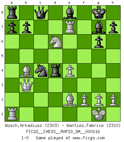 Last move : 1-0 2018 May 1 22:54:39 [Event "FICGS__CHESS__RAPID_SM__000016"] [Site "FICGS"] [Date "2018.02.23"] [Round "1"] [White "Wosch,Arkadiusz"] [Black "Wantiez,Fabrice"] [Result "1-0"] [WhiteElo "2303"] [BlackElo "2310"] 1.d4 Nf6 2.c4 g6 3.Nc3 d5 4.cxd5 Nxd5 5.e4 Nxc3 6.bxc3 Bg7 7.Nf3 c5 8.Rb1 O-O 9.Be2 cxd4 10.cxd4 Qa5+ 11.Bd2 Qxa2 12.O-O Nd7 13.Bb4 Nb6 14.Ra1 Qe6 15.Qd3 Rd8 16.Rfc1 Bd7 17.Rc7 Bc6 18.Rxe7 Qc8 19.Qb3 Be8 20.Ng5 Rxd4 21.Nxf7 Nc4 22.Nd6 1-0 King's Indian defense, 3.Nc3 Kingside Castling by player Black (move 8) Kingside Castling by player White (move 12) Player White won this chess game. Follow this game move after move (download)Chess is a part of culture and if a culture is declining then Chess too will decline. (Mikhail Botvinnik) Jeder Fehler erscheint unglaublich dumm, wenn andre ihn begehen. (Georg Christoph Lichtenberg) Ser exitoso en el Ajedrez te permite descubrir tu propia personalidad. Eso es lo que deseo para los niños de mi clase. (Saudin Robovic) L'attaque fait le spectacle, la défense gagne les matchs. (Dicton footballistique) It is not true that people stop pursuing dreams because they grow old, they grow old because they stop pursuing dreams. (Gabriel Garcia Marquez)