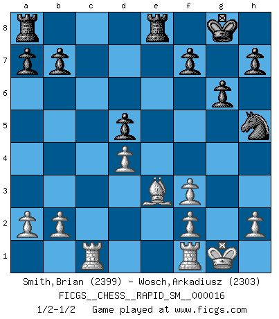 Last move : 1/2-1/2 2018 April 7 3:8:58 [Event "FICGS__CHESS__RAPID_SM__000016"] [Site "FICGS"] [Date "2018.02.23"] [Round "1"] [White "Smith,Brian"] [Black "Wosch,Arkadiusz"] [Result "1/2-1/2"] [WhiteElo "2399"] [BlackElo "2303"] 1.Nf3 Nf6 2.c4 c5 3.Nc3 e6 4.e3 Nc6 5.d4 d5 6.cxd5 exd5 7.Bb5 Bd6 8.O-O cxd4 9.Nxd4 O-O 10.Be2 Re8 11.Bf3 Be5 12.Rb1 Qb6 13.Nce2 Bxd4 14.Nxd4 Nxd4 15.Qxd4 Qxd4 16.exd4 Bf5 17.Ra1 Be4 18.Bg5 Bxf3 19.gxf3 Nh5 20.Be3 g6 21.Rac1 1/2-1/2 Reti Opening Kingside Castling by player White (move 8) Kingside Castling by player Black (move 9) This chess game ended in a draw. Follow this game move after move (download)Chess teaches you to control the initial excitement you feel when you see something that looks good and it trains you to think objectively when you're in trouble. (Stanley Kubrick) Mutter, ich bin eben Ex-Weltmeister geworden. --beim nach Hause Kommen nach dem Verlust des WM-Titels an Mihail Botvinnik -- (Mikhail Nekhemyevich Tal) Cuando estes solo, cuando te sientas un extraño en el mundo, juega al Ajedrez. Esto levantará tu espiritu y será tu consejero de guerra. (Aristóteles) Une platitude souvent récitée à propos des Echecs est qu'une des choses les plus difficiles à réaliser est de gagner une position gagnante. Cela ne manque pas de sens mais, pour ma part, j'ai toujours trouvé plus difficile de gagner une position perdante. (Tim Krabbe) Luck is what you have left over after you give 100 percent. (Langston Coleman)