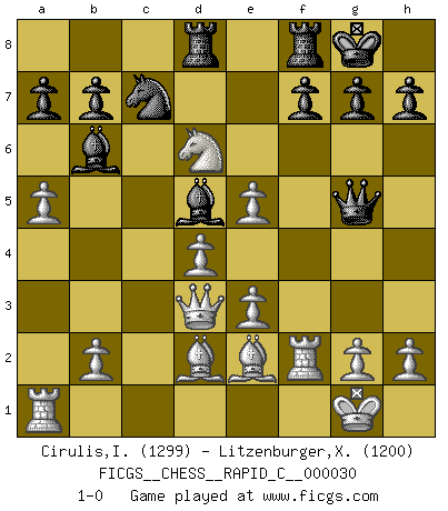 Last move : 1-0 2007 May 28 0:25:5 [Event "FICGS__CHESS__RAPID_C__000030"] [Site "FICGS"] [Date "2007.04.25"] [Round "1"] [White "Cirulis,Ilmars"] [Black "Litzenburger,Xavier"] [Result "1-0"] [WhiteElo "1299"] [BlackElo "1200"] 1.f4 e6 2.Nf3 d5 3.e3 Nf6 4.Nc3 Bc5 5.d4 Bb6 6.Be2 O-O 7.O-O Nc6 8.Ne5 Ne4 9.Nxe4 dxe4 10.Nc4 Nb4 11.Bd2 Nd5 12.a4 e5 13.fxe5 c5 14.c3 cxd4 15.cxd4 Be6 16.Qc2 Rc8 17.Qxe4 Nc7 18.Nd6 Bd5 19.Qd3 Qg5 20.Rf2 Rcd8 21.a5 1-0 Bird's Opening Kingside Castling by player Black (move 6) Kingside Castling by player White (move 7) Player White won this chess game. Follow this game move after move (download)You know, comrade Pachman, I don't enjoy being a Minister, I would rather play Chess like you. (Che Guevara) Nach Morphy wurde nichts neues mehr in der Behandlung offener Positionen gefunden. (Mikhail Moiseyevich Botvinik) No hay precio que sea tan grande por la cabellera del Rey enemigo. (Koblentz) Le moment que je préfère le plus dans une rencontre, c'est celui où je sens que la personnalité de l'adversaire se brise. (Robert Fischer) A government big enough to give you everything you want is strong enough to take everything you have. (Thomas Jefferson)
