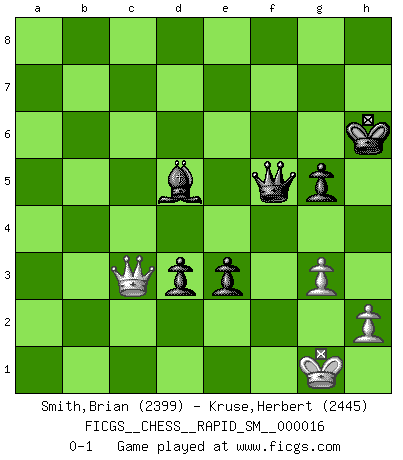 Last move : 0-1 2018 June 15 2:29:6 [Event "FICGS__CHESS__RAPID_SM__000016"] [Site "FICGS"] [Date "2018.02.23"] [Round "1"] [White "Smith,Brian"] [Black "Kruse,Herbert"] [Result "0-1"] [WhiteElo "2399"] [BlackElo "2445"] 1.Nc3 d5 2.e4 d4 3.Nce2 Nc6 4.Ng3 e5 5.Bb5 Nge7 6.d3 Be6 7.c4 Ng6 8.Nf3 Bb4+ 9.Nd2 O-O 10.a3 Bd6 11.O-O Nce7 12.Nf3 f6 13.b4 c5 14.Rb1 Qc7 15.Ba4 b6 16.Bd2 Nf4 17.Qc2 g5 18.bxc5 Bxc5 19.Bb4 Rf7 20.Bxc5 Qxc5 21.Ne2 Nxe2+ 22.Qxe2 Qxa3 23.Ra1 Qd6 24.Rfb1 Ng6 25.g3 Kg7 26.Bd1 Nf8 27.Ba4 h5 28.Qf1 h4 29.Rb2 Rc8 30.Rba2 R8c7 31.Qe2 Nd7 32.Bd1 Nc5 33.Nd2 a5 34.Nb3 hxg3 35.fxg3 Na6 36.Rb2 Rf8 37.Rab1 Nb4 38.Qd2 Qe7 39.Be2 f5 40.exf5 Bxf5 41.Rf1 Bg6 42.Rxf8 Kxf8 43.Rb1 Kg7 44.Ra1 Ra7 45.Rb1 Ra8 46.Bf1 Rf8 47.c5 bxc5 48.Nxa5 Rf3 49.Be2 Re3 50.Bf1 Qf6 51.Rb3 Bf7 52.Rb1 Qg6 53.Re1 Rxd3 54.Bxd3 Nxd3 55.Rd1 e4 56.Qc2 Bd5 57.Nb3 c4 58.Nxd4 Qf6 59.Rxd3 cxd3 60.Qc7+ Kh6 61.Qc3 e3 62.Nf5+ Qxf5 0-1 Dunst (Sleipner, Heinrichsen) Opening Kingside Castling by player Black (move 9) Kingside Castling by player White (move 11) 10 pieces endgame at move 62 : White KQPP , Black KQBPPP WHITE : King + 1 Queen 2 Pawns BLACK : King + 1 Queen 1 Bishop 3 Pawns Player Black won this chess game. Follow this game move after move (download)Chess is a sea in which a gnat may drink and an elephant may bathe. (Hindu proverb) Sicherlich können nur Meister einen Stil haben. Daß ein nicht-Meister auch nur ein einziges Mal in seinem Leben eine Partie folgerecht durchführte, habe ich niemals bemerkt. (Emanuel Lasker) Bobby Fischer es el mas grande genio de Ajedrez de todos los tiempos. (Alexander Kotov) Je ne crois pas en la psychologie, je crois aux bons coups. (Robert Fischer) If you don't practice you don't deserve to win. (Andre Agassi)