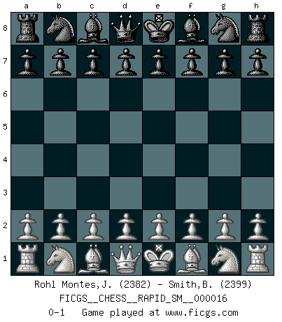Last move : 0-1 2018 March 26 7:15:53 [Event "FICGS__CHESS__RAPID_SM__000016"] [Site "FICGS"] [Date "2018.02.23"] [Round "1"] [White "Rohl Montes,Juan Armando"] [Black "Smith,Brian"] [Result "0-1"] [WhiteElo "2382"] [BlackElo "2399"] 0-1 This chess game has been lost on time (started : 2018.02.23 21:28:37) Player Black won this chess game. Follow this game move after move (download)The older I grow, the more I value pawns. (Paul Keres) Rauchen ist dem Schachspieler bei seiner Arbeit, also im Wettkampf, untersagt. (Viktor Kortschnoi) Ciertamente el estado mental actual de Bobby Fischer es una tragedia. Uno de los mas grandes jugadores de Ajedrez del mundo -el orgullo y pena del Ajedrez Americano. (Frank Brady) Un millionnaire : 'Monsieur Steinitz ! Vous ne participez aux tournois que pour l'argent, alors que moi je n'y viens que pour l'honneur.' Steinitz : 'Chacun joue pour ce qu'il n'a pas'... Even the best needles are not sharp at both ends. (Chinese proverb)