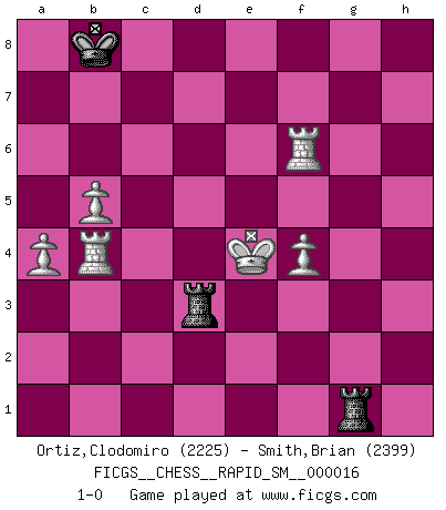 Last move : 1-0 2018 May 24 3:14:19 [Event "FICGS__CHESS__RAPID_SM__000016"] [Site "FICGS"] [Date "2018.02.23"] [Round "1"] [White "Ortiz,Clodomiro"] [Black "Smith,Brian"] [Result "1-0"] [WhiteElo "2225"] [BlackElo "2399"] 1.e4 d5 2.exd5 Nf6 3.d4 Bg4 4.Bb5+ c6 5.dxc6 Nxc6 6.Nf3 Qb6 7.Nc3 O-O-O 8.Bxc6 Qxc6 9.Qe2 a6 10.Be3 e6 11.O-O Bb4 12.Nb1 Ba5 13.c3 Bxf3 14.Qxf3 Qxf3 15.gxf3 Nd5 16.Nd2 Bc7 17.Rad1 Rd7 18.Ne4 b6 19.c4 Ne7 20.Nc3 Kb7 21.Kg2 Rc8 22.b3 Nf5 23.f4 Bd8 24.Rd3 Be7 25.Rb1 Rcd8 26.Rbd1 Bb4 27.Ne2 Kc6 28.Ng3 Ne7 29.Bc1 b5 30.Bb2 Ng6 31.Kf3 Bf8 32.Bc3 Nh4+ 33.Kg4 Be7 34.f5 exf5+ 35.Nxf5 h5+ 36.Kf4 Nxf5 37.Kxf5 Kb7 38.d5 g6+ 39.Ke4 Rc8 40.Rb1 Ka8 41.Rf3 Bd6 42.Kd3 Bxh2 43.Rf6 Bd6 44.f4 Kb7 45.Be5 Bf8 46.Bd4 Bd6 47.Rc1 Bc7 48.Ke4 Re7+ 49.Kf3 Rd7 50.cxb5 a5 51.Rc4 Re8 52.Rfc6 h4 53.Ra6 Rxd5 54.Ra7+ Kb8 55.R4xc7 Rxd4 56.Rcb7+ Kc8 57.Rxf7 Kb8 58.Rfb7+ Kc8 59.Rh7 Kb8 60.Rab7+ Ka8 61.Rbg7 Rd6 62.Rxh4 Rf8 63.Rg4 R8f6 64.a3 Kb8 65.a4 Kc8 66.Rh4 Rd8 67.Rh2 Re8 68.Rc2+ Kb8 69.Rc4 Rd6 70.b4 axb4 71.Rxb4 Rd3+ 72.Kg4 Re1 73.Rxg6 Rd5 74.Rf6 Rg1+ 75.Kf3 Rd3+ 76.Ke4 1-0 Scandinavian defense Queenside Castling by player Black (move 7) Kingside Castling by player White (move 11) 10 pieces endgame at move 71 : White KRRPPP , Black KRRP WHITE : King + 2 Rooks 3 Pawns BLACK : King + 2 Rooks 1 Pawn 9 pieces endgame at move 73 : White KRRPPP , Black KRR WHITE : King + 2 Rooks 3 Pawns BLACK : King + 2 Rooks Player White won this chess game. Follow this game move after move (download)Pawns are born free, yet they are everywhere in chains. (Rick Kennedy) Vom Schach wurde gesagt das Leben sei dafür nicht lange genug. Aber das ist der Fehler des Lebens, nicht des Schach'. (Irving Chernev) Una buena ofensiva y una buena defensa, comienzan ambas con un buen desarrollo. (Bruce A. Moon) La menace est plus forte que l'exécution. (Aaron Nimzovitch) Man is still the most extraordinary computer of all. (John F. Kennedy)
