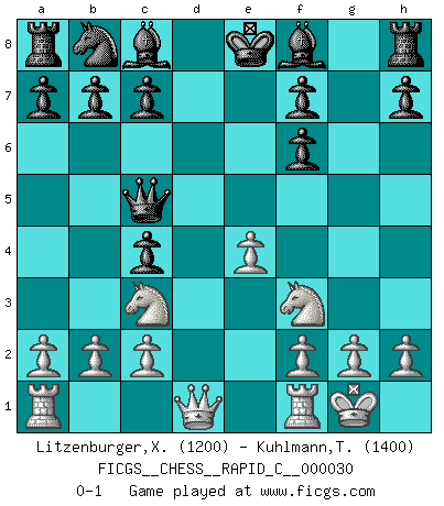 Last move : 0-1 2007 May 5 14:33:27 [Event "FICGS__CHESS__RAPID_C__000030"] [Site "FICGS"] [Date "2007.04.25"] [Round "1"] [White "Litzenburger,Xavier"] [Black "Kuhlmann,Tony"] [Result "0-1"] [WhiteElo "1200"] [BlackElo "1400"] 1.e4 d6 2.d4 Nf6 3.Nc3 e5 4.Bc4 Qe7 5.Nf3 exd4 6.Nxd4 d5 7.O-O dxc4 8.Bg5 Qe5 9.Bxf6 gxf6 10.Nf3 Qc5 0-1 Pirc defense Kingside Castling by player White (move 7) Player Black won this chess game. Follow this game move after move (download)If a ruler does not understand Chess, how can he rule over a kingdom ? (King Khusros II) Pläne sind die Träume des Verständigen. (Ernst Freiherr von Feuchtersleben) Todavía soy una víctima del Ajedrez. Tiene toda la belleza del arte y mucho mas. No puede ser comercializado. El Ajedrez es mas puro que el arte en su posición social. (Marcel Duchamp) Les échecs c'est le défi de l'alpiniste, toujours plus haut, prêt à tout pour monter à l'assaut du Roi ennemi. Les échecs, c'est de la musique en mouvement, un ballet majestueux pour les yeux. C'est de la poésie composée par les fantômes du passé qui au même titre que Rimbaud ou Verlaine méritent notre admiration. Les échecs, c'est de la peinture ou le moindre mouvement modifie le tableau pour en faire un Picasso ou un Van Gogh. Les échecs, c'est tout et rien, c'est la vie et la mort. Jjulie33 sur le forum de France-Echecs. If computers get too powerful, we can organize them into committees. That'll do them in. (Anonymous)