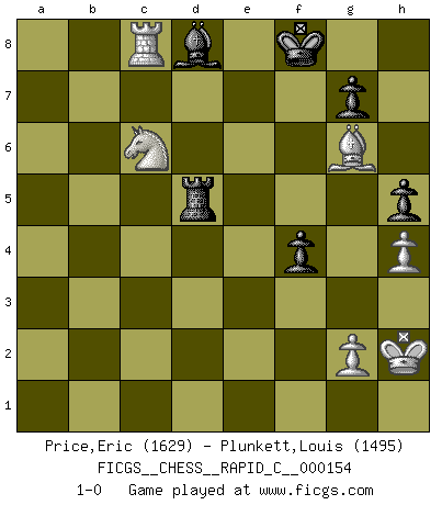 Last move : 1-0 2018 July 7 14:19:56 [Event "FICGS__CHESS__RAPID_C__000154"] [Site "FICGS"] [Date "2018.03.21"] [Round "1"] [White "Price,Eric"] [Black "Plunkett,Louis"] [Result "1-0"] [WhiteElo "1629"] [BlackElo "1495"] 1.d4 d5 2.Nf3 Nc6 3.c4 Bg4 4.cxd5 Qxd5 5.Nc3 Qd7 6.e3 e6 7.Be2 Nf6 8.O-O h5 9.a3 Bd6 10.e4 Bxf3 11.Bxf3 Ng4 12.e5 Ncxe5 13.dxe5 Bxe5 14.Qxd7+ Kxd7 15.h3 Bh2+ 16.Kh1 Be5 17.Rd1+ Ke7 18.Kg1 Nf6 19.Bxb7 Rab8 20.Bc6 Rb6 21.Ba4 Rhb8 22.Bg5 Rxb2 23.Rac1 Kf8 24.Bxf6 Bxf6 25.Ne4 Be7 26.Rxc7 R2b7 27.Rdc1 Rxc7 28.Rxc7 Bxa3 29.Rxa7 Bb2 30.Ng5 Be5 31.Rxf7+ Kg8 32.f4 Bd4+ 33.Kh2 e5 34.Bc2 exf4 35.Rd7 Be5 36.Nf3 Bf6 37.h4 Rb5 38.Bg6 Ra5 39.Rc7 Rd5 40.Ne5 Bd8 41.Rc8 Kf8 42.Nc6 1-0 Queen's pawn game, Chigorin variation Kingside Castling by player White (move 8) Player White won this chess game. Follow this game move after move (download)If a ruler does not understand Chess, how can he rule over a kingdom ? (King Khusros II) Die Idee von Capablanca, Schach als Fach in den Schulen zu lehren, ist großartig. (Fidel Castro) Debemos de asegurarnos de que el Ajedrez no se convierta en un lenguaje muerto, muy interesante, pero solo para un grupo muy pequeño. (Sytze Faber) Le temps de noter son nom sur la feuille de partie, j'étais déjà en zeitnot ! D'un modeste amateur apparié lors de la première ronde d'un open contre le grand-maître Azmaïparashvili. I know the human being and fish can coexist peacefully. (George W. Bush, Saginaw sept. 29, 2000)
