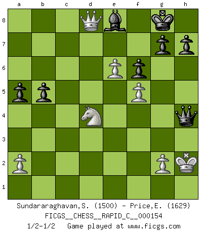 Last move : 1/2-1/2 2018 March 21 5:37:42 [Event "FICGS__CHESS__RAPID_C__000154"] [Site "FICGS"] [Date "2018.02.24"] [Round "1"] [White "Sundararaghavan,Shailesh"] [Black "Price,Eric"] [Result "1/2-1/2"] [WhiteElo "1500"] [BlackElo "1629"] 1.e4 e5 2.Nf3 Nc6 3.Bc4 Nf6 4.d4 exd4 5.Nxd4 d6 6.Nc3 Be7 7.Be3 O-O 8.O-O Ne5 9.Be2 c6 10.f4 Neg4 11.Bxg4 Nxg4 12.Bf2 Nxf2 13.Rxf2 Be6 14.f5 Bc4 15.Qg4 Bf6 16.Nf3 Bxc3 17.bxc3 f6 18.e5 Bf7 19.e6 Be8 20.Re1 Qe7 21.Rd2 d5 22.Kh1 a5 23.Red1 Rc8 24.h4 Rc7 25.c4 Qb4 26.Qg3 Re7 27.cxd5 cxd5 28.Rxd5 Bc6 29.Rd8 Be8 30.h5 Bxh5 31.Rxf8+ Kxf8 32.Qb8+ Be8 33.Rd7 b5 34.Rxe7 Qxe7 35.Nd4 Qa3 36.c3 Qxc3 37.Qd6+ Kg8 38.Qd8 Qe1+ 39.Kh2 Qh4+ 40.Kg1 Qe1+ 41.Kh2 Qh4+ 42.Kg1 Qe1+ 43.Kh2 Qh4+ 1/2-1/2 Two knights defense Kingside Castling by player Black (move 7) Kingside Castling by player White (move 8) This chess game ended in a draw. Follow this game move after move (download)An attack on the wing should be met by play in the center. (Nimzovitch) Ivan Sokolov treibt mich als Beifahrer an mit go Loeky go - . (Loek van Wely) Bobby Fischer es el mas grande genio de Ajedrez de todos los tiempos. (Alexander Kotov) Les Echecs sont et restent toujours un combat, un combat intégral comme la boxe, la lutte ou un autre sport, et où il doit y avoir un vainqueur et un vaincu. (Joseph Emil Diemer) He who laughs last probably does not get the joke. (Unknown)