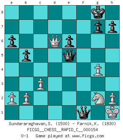 Last move : 0-1 2018 March 1 12:11:20 [Event "FICGS__CHESS__RAPID_C__000154"] [Site "FICGS"] [Date "2018.02.24"] [Round "1"] [White "Sundararaghavan,Shailesh"] [Black "Farnik,Kym"] [Result "0-1"] [WhiteElo "1500"] [BlackElo "1830"] 1.e4 c5 2.Nf3 d6 3.d4 cxd4 4.Nxd4 Nf6 5.Nc3 a6 6.Be2 b5 7.Bg5 Nbd7 8.O-O Bb7 9.Bxf6 Nxf6 10.Bf3 Rc8 11.e5 Bxf3 12.Qxf3 dxe5 13.Nf5 e6 14.Ne3 Bc5 15.Rad1 Qc7 16.Ne4 Nxe4 17.Qxe4 O-O 18.Qf3 f5 19.Qh3 e4 20.g4 f4 21.Ng2 Qe5 22.c3 e3 23.fxe3 fxe3 24.Rxf8+ Rxf8 25.Kh1 e2 26.Qd3 Bd6 27.Qxd6 Rf1+ 28.Rxf1 exf1Q+ 0-1 Sicilian : Najdorf, Opovcensky variation Kingside Castling by player White (move 8) Kingside Castling by player Black (move 17) Promotion Queen by player Black (move 28) Player Black won this chess game. Follow this game move after move (download)War is the child of passion, passion is the child of narcissism and narcissism is the child. (...) Another game ? (Thibault de Vassal) Meine Liebe ist Schach, Schach, Schach. Ich muss jeden Tag Schach spielen, deshalb fühle ich mich so stark. (Miguel Najdorf) Debemos de asegurarnos de que el Ajedrez no se convierta en un lenguaje muerto, muy interesante, pero solo para un grupo muy pequeño. (Sytze Faber) La guerre est enfant de la passion, la passion est enfant du narcissisme et le narcissisme est l'enfant. (...) Une autre partie ? (Thibault de Vassal) I've lost money so fast in these clubs it's left me reeling. I've read every poker book ever written, but the only way to get better at the game is to go out and play with people who are really good. The problem is, you stand to lose a lot of money doing it. (Matt Damon)