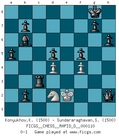 Last move : 0-1 2018 May 23 23:51:23 [Event "FICGS__CHESS__RAPID_D__000110"] [Site "FICGS"] [Date "2018.02.24"] [Round "1"] [White "Konyukhov,Konstantin"] [Black "Sundararaghavan,Shailesh"] [Result "0-1"] [WhiteElo "1500"] [BlackElo "1500"] 1.d4 d5 2.Nc3 Nf6 3.f4 Nc6 4.e3 e6 5.g4 Bb4 6.a3 Bxc3+ 7.Kf2 Ba5 8.Bd2 Ne4+ 9.Ke2 Bxd2 10.Bg2 Ba5 11.b4 Nc3+ 12.Ke1 Nxd1 13.Rxd1 Bb6 14.Bh3 O-O 15.Nf3 a5 16.b5 Ne7 17.a4 f5 18.Ng5 h6 19.Nf3 fxg4 20.Bxg4 Nf5 21.Bxf5 exf5 22.h4 Re8 23.Rd3 c5 24.c3 c4 25.Rd2 Rxe3+ 26.Kf2 Rxc3 27.Ne1 Ra3 28.Nf3 Rxa4 29.Re1 Bd7 30.Kg3 c3 31.Rc2 Rc8 32.Rd1 Bxb5 33.Ng1 Rb4 34.Nf3 Ba4 35.Rdc1 Bxc2 36.Rxc2 Rb2 37.Rxb2 cxb2 38.Nd2 Rc3+ 39.Kf2 Qxh4+ 40.Ke2 Qh2+ 0-1 This chess game has been lost on time (started : 2018.02.24 15:59:53) Queen's pawn : Chigorin variation Kingside Castling by player Black (move 14) Player Black won this chess game. Follow this game move after move (download)Chess is no whit inferior to the violin, and we have a large number of professional violinists. (Mikhail Botvinnik) Gewöhnliche Menschen denken nur daran, wie sie ihre Zeit verbringen. Ein intelligenter Mensch versucht, sie auszunutzen. (Arthur Schopenhauer) Tu sabes que vas a perder. Aún cuando tenía la ventaja, yo sabía que iba a perder. - al estar jugando con Fischer (Andrew Soltis) Celui qui prend des risques peut perdre, celui qui n'en prend pas perd toujours. (Xavier Tartacover) There are three kinds of lies: lies, damned lies and statistics. (Mark Twain)