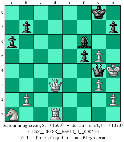 Last move : 0-1 2018 June 28 0:54:26 [Event "FICGS__CHESS__RAPID_D__000110"] [Site "FICGS"] [Date "2018.03.21"] [Round "1"] [White "Sundararaghavan,Shailesh"] [Black "de la Foret,Fred"] [Result "0-1"] [WhiteElo "1500"] [BlackElo "1373"] 1.e4 c5 2.Nf3 d6 3.d4 cxd4 4.Nxd4 Nf6 5.Nc3 a6 6.Be2 e5 7.Nb3 Be7 8.Bg5 O-O 9.O-O Be6 10.Bxf6 Bxf6 11.Bf3 Nc6 12.Nd5 Bg5 13.c4 Ne7 14.Nxe7+ Qxe7 15.Qe2 Rfc8 16.Rfd1 Bxc4 17.Qe1 Be6 18.g3 Rc2 19.Rab1 Rac8 20.Na1 R2c4 21.Qe2 g6 22.Bg4 Bxg4 23.Qxg4 f5 24.Qe2 Rxe4 25.Qf3 Qe6 26.Qd3 Qxa2 27.Qxd6 Qf7 28.Kg2 Rd8 29.Qc5 Red4 30.Rxd4 exd4 31.Rd1 d3 32.f4 Qe6 33.Qe5 Qc6+ 34.Kh3 Bf6 35.Qa5 Qf3 36.Qd2 g5 37.fxg5 Rd4 38.Qxd3 Rh4+ 39.Kxh4 Qg4+ 0-1 Sicilian : Najdorf, Opovcensky variation Kingside Castling by player Black (move 8) Kingside Castling by player White (move 9) Player Black won this chess game. Follow this game move after move (download)Chess is really ninety nine percent calculation. (Soltis) Vom Schach wurde gesagt das Leben sei dafür nicht lange genug. Aber das ist der Fehler des Lebens, nicht des Schach'. (Irving Chernev) Un buen jugador siempre tiene buena suerte. (José Raúl Capablanca) Des idées, des idées, j'en ai cent, j'en ai mille. Des bonnes, des mauvaises, applicables, irréalisables... Il suffit de faire le tri ! (Roos) Now the reason the enlightened prince and the wise general conquer the enemy whenever they move and their achievements surpass those of ordinary men is foreknowledge. (Sun Tzu)