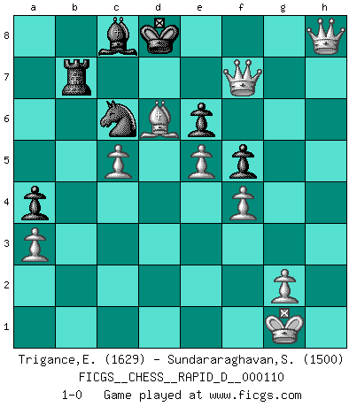 Last move : 1-0 2018 March 17 22:46:7 [Event "FICGS__CHESS__RAPID_D__000110"] [Site "FICGS"] [Date "2018.02.24"] [Round "1"] [White "Trigance,Emile"] [Black "Sundararaghavan,Shailesh"] [Result "1-0"] [WhiteElo "1629"] [BlackElo "1500"] 1.Nf3 Nf6 2.c4 Nc6 3.d4 d5 4.cxd5 Nxd5 5.e4 Nf6 6.Nc3 e6 7.Bb5 Bd7 8.O-O Be7 9.h3 O-O 10.Bf4 a6 11.Ba4 h6 12.a3 b5 13.Bc2 b4 14.Na4 bxa3 15.bxa3 Nh7 16.Nc5 Bxc5 17.dxc5 Qe7 18.Bxc7 Rfc8 19.Bd6 Qf6 20.Rb1 Ng5 21.Nxg5 Qxg5 22.f4 Qd8 23.e5 g6 24.Be4 a5 25.Rf3 Ra6 26.Qd3 Ra7 27.Bxg6 f5 28.Rg3 Kh8 29.Qf3 Qh4 30.Qf2 Rg8 31.R1b3 a4 32.Bf7 Rxg3 33.Rxg3 Kh7 34.Rg7+ Kxg7 35.Qxh4 Kxf7 36.Qxh6 Bc8 37.h4 Rb7 38.h5 Ke8 39.Qf8+ Kd7 40.h6 Rb3 41.Qf7+ Kd8 42.h7 Rb7 43.h8Q+ 1-0 Reti Opening Kingside Castling by player White (move 8) Kingside Castling by player Black (move 9) Promotion Queen by player White (move 43) Player White won this chess game. Follow this game move after move (download)In a gambit you give up a Pawn for the sake of getting a lost game. (Samuel Standige Boden) Wenn Dein Gegner dir ein Remis anbietet, versuch herauszufinden, weshalb er glaubt schlechter zu stehen. (Nigel Short) Tu eres para mi la Reina en d8 y yo soy el Peón en d7!!. (GM Eduard Gufeld) Ce qui est bien, c'est d'avoir tout un tas de pièces en prise : l'adversaire ne peut en prendre qu'une à la fois. Cité par Thierry Audin. Computers make it easier to do a lot of things, but most of the things they make it easier to do don't need to be done. (Andy Rooney)