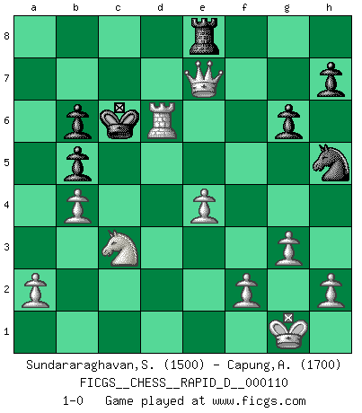 Last move : 1-0 2018 March 17 20:47:10 [Event "FICGS__CHESS__RAPID_D__000110"] [Site "FICGS"] [Date "2018.02.24"] [Round "1"] [White "Sundararaghavan,Shailesh"] [Black "Capung,Albab"] [Result "1-0"] [WhiteElo "1500"] [BlackElo "1700"] 1.e4 e6 2.d4 c5 3.Nf3 cxd4 4.Nxd4 Bc5 5.Be3 Qa5+ 6.Nc3 Qb6 7.Rb1 e5 8.Nf5 g6 9.Bxc5 Qxc5 10.Ne3 Nf6 11.Bc4 a6 12.Qf3 Nh5 13.Qxf7+ Kd8 14.Ncd5 Nc6 15.b4 Qd6 16.Nb6 Rb8 17.Nxc8 Kxc8 18.O-O Nd4 19.c3 Nb5 20.Rbd1 Qc6 21.Bxb5 axb5 22.Rd5 b6 23.g3 Kc7 24.Rfd1 Rbd8 25.Rxe5 Qxc3 26.Nd5+ Kd6 27.Qe7+ Kc6 28.Nxc3 d6 29.Red5 Rhe8 30.Rxd6+ Rxd6 31.Rxd6+ 1-0 French defense Kingside Castling by player White (move 18) Player White won this chess game. Follow this game move after move (download)When I have White, I win because I am white; When I have Black, I win because I am Bogolyubov. (Bogolyubov) Nur ein wirklich starker Spieler weiß wie schwach er spielt. (Savielly Grigorievitsch Tartakower) Yo jugué Ajedrez con el y a veces le pude haber ganado solo que siempre devuelve su última jugada y juega la partida de manera diferente. (Mark Twain) 'L'échange des dames est un coup dur pour les deux adversaires...' Un journaliste lors d'une partie du match Spassky-Fischer If passion drives you, let reason holds the reins. (Benjamin Franklin)
