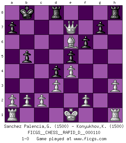Last move : 1-0 2018 May 22 11:47:49 [Event "FICGS__CHESS__RAPID_D__000110"] [Site "FICGS"] [Date "2018.03.21"] [Round "1"] [White "Sanchez Palencia,Gonzalo"] [Black "Konyukhov,Konstantin"] [Result "1-0"] [WhiteElo "1500"] [BlackElo "1500"] 1.e4 e5 2.Nc3 c5 3.Nf3 d6 4.Bc4 Bg4 5.h3 Bh5 6.d3 Nc6 7.g4 Bg6 8.Bg5 Be7 9.Be3 Nd4 10.Nd5 h5 11.Nxe7 Nxe7 12.Nxd4 cxd4 13.Bg5 f6 14.Bd2 hxg4 15.Qxg4 d5 16.Bxd5 Rc8 17.Bb3 b5 18.Bb4 Nc6 19.Qxg6+ Kd7 20.Qf7+ Ne7 21.Be6+ Kc7 22.Ba5+ Kb8 23.Bxd8 Rcxd8 24.Qxe7 1-0 This chess game has been lost on time (started : 2018.03.21 15:56:31) Vienna game Player White won this chess game. Follow this game move after move (download)The only thing Chess players have in common is Chess. (Lodewijk Prins) Frage: Gibt es etwas was Sie mehr lieben als Autobahnen ohne Tempobegrenzungen? - Antwort: Deutsche Frauen ohne Tempobegrenzungen. (Loek van Wely) Bobby es el jugador de Ajedrez mas fino que este país jamás haya producido. Su memoria para las movidas, su brillantez en soñar combinaciones y su feróz determinación por la victoria son algo extraño. (John Collins) Les erreurs sont comme les malheurs, elles n'arrivent jamais seules. (Siegbert Tarrasch) Don't be irreplaceable, if you can't be replaced, you can't be promoted. (Dan Rotaru)