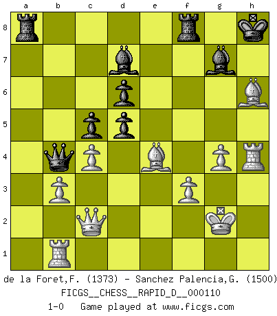 Last move : 1-0 2018 May 7 16:35:14 [Event "FICGS__CHESS__RAPID_D__000110"] [Site "FICGS"] [Date "2018.03.21"] [Round "1"] [White "de la Foret,Fred"] [Black "Sanchez Palencia,Gonzalo"] [Result "1-0"] [WhiteElo "1373"] [BlackElo "1500"] 1.d4 Nf6 2.c4 g6 3.Nf3 Bg7 4.Nc3 d6 5.e4 O-O 6.Be2 e5 7.d5 a5 8.Be3 Ng4 9.Bg5 f6 10.Bd2 f5 11.Bg5 Qe8 12.h3 Nf6 13.O-O Nxe4 14.Nxe4 fxe4 15.Nd2 Bf5 16.g4 Bd7 17.Nxe4 Na6 18.Qd2 b6 19.b3 Nc5 20.f3 Rf7 21.Rae1 Qf8 22.Kg2 h6 23.Nxc5 bxc5 24.Be3 a4 25.Bd3 g5 26.Bg6 Rf6 27.Be4 axb3 28.axb3 Qb8 29.Rb1 Qb4 30.Qc2 R6f8 31.Bh7+ Kh8 32.h4 gxh4 33.Rh1 c6 34.Rxh4 cxd5 35.Bxh6 e4 36.Bxe4 1-0 King's Indian, 3.Nf3 Kingside Castling by player Black (move 5) Kingside Castling by player White (move 13) Player White won this chess game. Follow this game move after move (download)Some sacrifices are sound; the rest are mine. (Mikhail Tal) Im Hotelzimmer gab es nur zwei Schaben. (Über die Turnierbedingungen) (Peter Swidler) Una de estas pequeñas movidas modestas pudieran ser mas molestas a tu oponente que la amenaza mas grande. (Siegbert Tarrasch) Nous vivons dans un monde échiquéen : chaque jour qui passe est un défi à relever. (Philosophe Sasha) Art is not a thing, it is a way. (Elbert Hubbard)