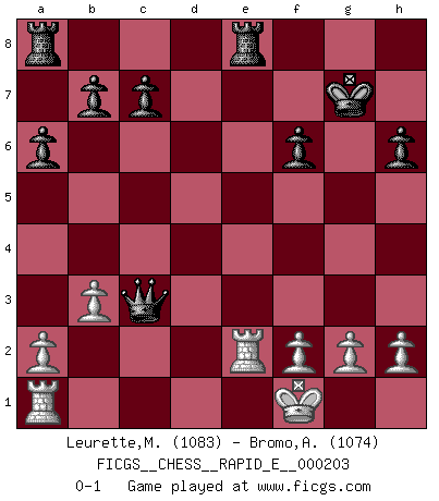 Last move : 0-1 2018 March 5 21:14:18 [Event "FICGS__CHESS__RAPID_E__000203"] [Site "FICGS"] [Date "2018.02.25"] [Round "1"] [White "Leurette,Marc-Antoine"] [Black "Bromo,Alexis"] [Result "0-1"] [WhiteElo "1083"] [BlackElo "1074"] 1.e4 e5 2.Nf3 Nc6 3.Bc4 h6 4.d4 exd4 5.Nxd4 d6 6.O-O Be7 7.Qf3 Nf6 8.Nc3 Nxd4 9.Qg3 O-O 10.Bd3 a6 11.Be3 Nh5 12.Qxg7+ Kxg7 13.Bxd4+ f6 14.Be2 Nf4 15.Be3 Nxe2+ 16.Nxe2 d5 17.exd5 Qxd5 18.c3 Re8 19.b3 Bc5 20.Bxc5 Qxc5 21.Rfe1 Bg4 22.Kf1 Bxe2+ 23.Rxe2 Qxc3 0-1 King's pawn game Kingside Castling by player White (move 6) Kingside Castling by player Black (move 9) Player Black won this chess game. Follow this game move after move (download)I'm not a materialistic person, in that, I don't suffer the lack or loss of money. The absence of worldly goods I don't look back on. For Chess is a way I can be as materialistic as I want without having to sell my soul. (Jamie Walter Adams) Alle offensichtlichen Züge sehen nach dem Spiel in der Analyse verdächtig aus. (Viktor Kortschnoi) En posiciones complicadas, Bobby Fischer pocas veces tuvo que temer de cualquiera. (Paul Keres) Ce qui est bien, c'est d'avoir tout un tas de pièces en prise : l'adversaire ne peut en prendre qu'une à la fois. Cité par Thierry Audin. Without deviation from the norm, progress is not possible. (Frank Zappa)