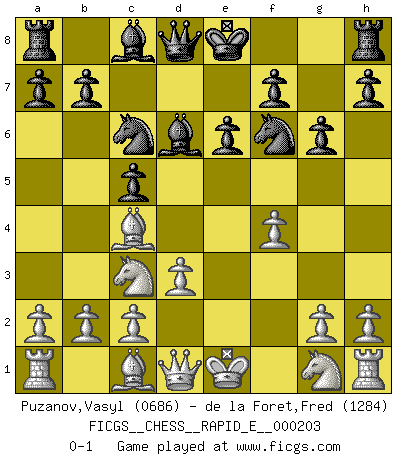 Last move : 0-1 2018 April 7 8:23:25 [Event "FICGS__CHESS__RAPID_E__000203"] [Site "FICGS"] [Date "2018.02.25"] [Round "1"] [White "Puzanov,Vasyl"] [Black "de la Foret,Fred"] [Result "0-1"] [WhiteElo "0686"] [BlackElo "1284"] 1.e4 c5 2.f4 Nc6 3.Bc4 g6 4.Nc3 e6 5.e5 d5 6.exd6 Bxd6 7.d3 Nf6 0-1 This chess game has been lost on time (started : 2018.02.25 6:6:0) Sicilian : Grand Prix attack Player Black won this chess game. Follow this game move after move (download)It is no time to be playing Chess when the house is on fire. (Italian Proverb) Schach ist ein schwarz-weisser Dschungel. (Garry Kasparov) El ganador de una partida es aquel jugador que hace el penúltimo error. (Savielly Tartakover) Les Echecs, c'est l'art de la guerre sans les charniers, c'est la résurrection des morts tombés au champ d'honneur, l'espoir perpétuel, la suprématie de l'intelligence sur la force, la culture de l'esprit. (F. Szpiner) Bobby never cared about money, though. His only desire was to prove that his choices were correct: He wanted chess to be important because he was a chess player, and he wanted to be important. Bobby knew money was important, but he didn't have a clue why, outside of clothes and status. The only way he could accomplish what he wanted was to fight for a lot of money. Once he got it, he gave it away. He did not know how to spend it. And once he'd become champion, after, essentially, sacrificing his life for it, he didn't know how to spend his time. (Bob Wade)