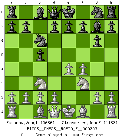 Last move : 0-1 2018 April 7 8:23:25 [Event "FICGS__CHESS__RAPID_E__000203"] [Site "FICGS"] [Date "2018.02.25"] [Round "1"] [White "Puzanov,Vasyl"] [Black "Strohmeier,Josef"] [Result "0-1"] [WhiteElo "0686"] [BlackElo "1182"] 1.e4 c5 2.f4 Nc6 3.Nc3 g6 4.Nf3 Bg7 0-1 This chess game has been lost on time (started : 2018.02.25 6:6:0) Sicilian : Grand Prix attack Player Black won this chess game. Follow this game move after move (download)Chess opens and enriches your mind. (Saudin Robovic) Ich weiss nicht was Gott gegen mich auf 1.e4 antworten würde. (Robert James Fischer) Después de una mala apertura, hay una esperanza en el juego medio. Pero una vez que estas en finales, el momento de la verdad ha llegado. (Edmar Mednis) Mais l'homme est une créature légère et illogique : semblable au joueur d'échecs, il n'aime que le processus du but à atteindre, non le but lui-même. (Dostoïevsky) Hold em is to stud what chess is to checkers. (Johnny Moss)