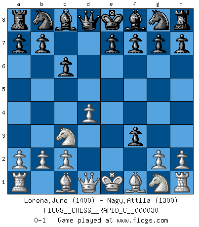 Last move : 0-1 2007 June 24 2:40:25 [Event "FICGS__CHESS__RAPID_C__000030"] [Site "FICGS"] [Date "2007.04.25"] [Round "1"] [White "Lorena,June"] [Black "Nagy,Attila"] [Result "0-1"] [WhiteElo "1400"] [BlackElo "1300"] 1.d4 d5 2.e4 c6 3.Nc3 dxe4 4.f3 exf3 0-1 This chess game has been lost on time (started : 2007.04.25 13:13:9) Blackmar gambit Player Black won this chess game. Follow this game move after move (download)We like to think. (Gary Kasparov) Der Vorposten provoziert a) eine Basis für neue Angriffe und b) eine Schwächung der gegnerischen Widerstandskraft in der fraglichen Linie. (Aaron Nimzowitsch) El Ajedrez es parte de la cultura, y si una cultura esta en decadencia, entonces también el Ajedrez declinará. (Mikhail Botvinnik) Je ne crois pas en la psychologie, je crois aux bons coups. (Robert Fischer) Control your own destiny or someone else will. (Jack Welch)