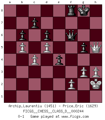 Last move : 0-1 2018 March 21 21:25:34 [Event "FICGS__CHESS__CLASS_D__000244"] [Site "FICGS"] [Date "2018.02.26"] [Round "1"] [White "Archip,Laurentiu"] [Black "Price,Eric"] [Result "0-1"] [WhiteElo "1451"] [BlackElo "1629"] 1.c4 Nf6 2.d4 e6 3.Nc3 Bb4 4.Bd2 O-O 5.Nf3 b6 6.e3 Bb7 7.Be2 d6 8.a3 Bxc3 9.Bxc3 Nbd7 10.O-O Ne4 11.Qc2 f5 12.Nd2 Qg5 13.Nf3 Qh6 14.Rad1 Rf7 15.d5 g5 16.h3 e5 17.b4 Nxc3 18.Qxc3 Raf8 19.Qc1 Bc8 20.e4 Rg7 21.exf5 Rxf5 22.Nh2 Rf8 23.Qc2 Nf6 24.Ng4 Nxg4 25.Bxg4 Qf6 26.Bxc8 Rxc8 27.b5 h5 28.Rd3 Qg6 29.Qe2 Rf8 30.Rf3 Rgf7 31.Rxf7 Qxf7 32.a4 Qg6 33.Ra1 Qf6 34.a5 e4 35.axb6 Qxa1+ 36.Kh2 Qe5+ 37.g3 axb6 38.Qxh5 Qf6 0-1 English, 1...Nf6 (Anglo-Indian defense) Kingside Castling by player Black (move 4) Kingside Castling by player White (move 10) Player Black won this chess game. Follow this game move after move (download)Why must I lose to this idiot ? (Aron Nimzovich) Man wirke der falschen Auffassung entgegen, als ob jeder Zug Unmittelbares zu leisten habe; auch Werte- und Ruhezüge haben ihre Existenzberechtigung. (Aaron Nimzowitsch) El Ajedrez es sobre todo, ¡una pelea!. (Emanuel Lasker) Psychologiquement, tu dois avoir confiance en toi même, mais cette confiance doit être basée sur des faits. (Robert Fischer) Better than a thousand days of diligent study is one day with a great teacher. (Japanese proverb)