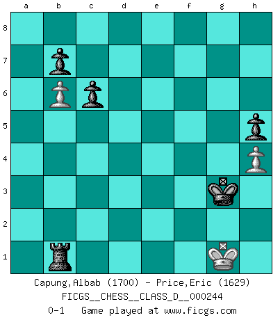 Last move : 0-1 2018 March 19 19:22:46 [Event "FICGS__CHESS__CLASS_D__000244"] [Site "FICGS"] [Date "2018.02.26"] [Round "1"] [White "Capung,Albab"] [Black "Price,Eric"] [Result "0-1"] [WhiteElo "1700"] [BlackElo "1629"] 1.e3 d5 2.c4 Nf6 3.cxd5 Nxd5 4.Bc4 e5 5.Qf3 c6 6.Nc3 Be6 7.e4 Nc7 8.d3 Bc5 9.a3 a5 10.Bxe6 Nxe6 11.Qg3 Bd4 12.Nf3 Nd7 13.O-O Qf6 14.Ne2 Ba7 15.b4 axb4 16.Bb2 O-O 17.Nxe5 Nxe5 18.Bxe5 Qg6 19.axb4 Qh5 20.Nf4 Qg5 21.Nxe6 Qxg3 22.Bxg3 fxe6 23.Rab1 Bd4 24.b5 e5 25.b6 g5 26.h3 Ra2 27.Rb4 h5 28.h4 g4 29.Kh1 Rfa8 30.f4 gxf3 31.gxf3 R8a3 32.Rg1 Kf7 33.f4 Bxg1 34.Kxg1 Rxd3 35.Bf2 Rd1+ 36.Kg2 R1d2 37.fxe5 Rxf2+ 38.Kg1 Rfb2 39.Rxb2 Rxb2 40.e6+ Kxe6 41.e5 Kxe5 42.Kf1 Kd4 43.Ke1 Kd3 44.Kf1 Ke3 45.Kg1 Kf3 46.Kh1 Kg3 47.Kg1 Rb1+ 0-1 Van't Kruijs Opening Kingside Castling by player White (move 13) Kingside Castling by player Black (move 16) 10 pieces endgame at move 39 : White KPPPP , Black KRPPP WHITE : King + 4 Pawns BLACK : King + 1 Rook 3 Pawns 9 pieces endgame at move 40 : White KPPP , Black KRPPP WHITE : King + 3 Pawns BLACK : King + 1 Rook 3 Pawns 8 pieces endgame at move 41 : White KPP , Black KRPPP WHITE : King + 2 Pawns BLACK : King + 1 Rook 3 Pawns Player Black won this chess game. Follow this game move after move (download)It's always better to sacrifice your opponent's men. (Savielly Tartakover) Du musst Deinen Gegner in einen tiefen dunklen Wald führen wo 2+2=5 ist und wo der Weg, der wieder hinausführt, nur breit genug für einen ist. (Mikhail Nekhemyevich Tal) El Ajedrez es como la guerra en un tablero. (Bobby Fischer) Des combinaisons [dans le jeu d'échecs] pareilles à des mélodies. Je crois entendre pour ainsi dire la musique des coups... (Vladimir Nabokov) History is a gallery of pictures in which there are few originals and many copies. (Alexis de Tocqueville)