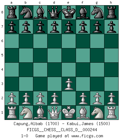 Last move : 1-0 2018 April 8 8:31:37 [Event "FICGS__CHESS__CLASS_D__000244"] [Site "FICGS"] [Date "2018.02.26"] [Round "1"] [White "Capung,Albab"] [Black "Kabui,James"] [Result "1-0"] [WhiteElo "1700"] [BlackElo "1500"] 1.e3 1-0 This chess game has been lost on time (started : 2018.02.26 20:24:39) Van't Kruijs Opening Player White won this chess game. Follow this game move after move (download)Play the opening like a book, the middle game like a magician, and the endgame like a machine. (Spielmann) Karpov ist ein Museumsstück. (Garry Kasparov) Peones: ellos son el alma de esta partida, solos forman el ataque y la defensa. (Philidor) Il a essayé de se convaincre qu'il pourrait empêcher toutes les erreurs et ne jamais perdre. L'horreur ! Gary Kasparov au sujet de Robert Fischer. He who fights with monsters should be careful lest he thereby become a monster. (Friedrich Nietzsche, Beyond Good and Evil)