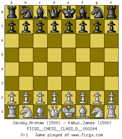 Last move : 0-1 2018 April 8 8:31:37 [Event "FICGS__CHESS__CLASS_D__000244"] [Site "FICGS"] [Date "2018.02.26"] [Round "1"] [White "Jacoby,Arsham"] [Black "Kabui,James"] [Result "0-1"] [WhiteElo "1500"] [BlackElo "1500"] 0-1 This chess game has been lost on time (started : 2018.02.26 20:24:39) Player Black won this chess game. Follow this game move after move (download)I played Chess with him and would have beaten him sometimes only he always took back his last move, and ran the game out differently. (Mark Twain) Schach verlangt totale Konzentration. (Robert James Fischer) Un sacrificio se refuta mucho mejor al aceptarlo. (Wilhelm Steinitz) Celui qui prend des risques peut perdre, celui qui n'en prend pas perd toujours. (Xavier Tartacover) If you work for a living, why do you kill yourself working ? (Tuco to a chicken in The Good, The Bad and The Ugly)