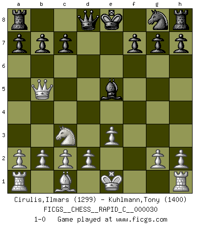 Last move : 1-0 2007 May 16 20:42:51 [Event "FICGS__CHESS__RAPID_C__000030"] [Site "FICGS"] [Date "2007.04.25"] [Round "1"] [White "Cirulis,Ilmars"] [Black "Kuhlmann,Tony"] [Result "1-0"] [WhiteElo "1299"] [BlackElo "1400"] 1.f4 e5 2.fxe5 d6 3.Nf3 dxe5 4.Nxe5 Bh3 5.Nc3 Nd7 6.Nf3 Bg4 7.e3 Ne5 8.Be2 Bd6 9.Nxe5 Bxe2 10.Qxe2 Bxe5 11.Qb5+ 1-0 Bird : From gambit Player White won this chess game. Follow this game move after move (download)Chess is everything: art, science and sport. (Anatoly Karpov) Korrekt heißt in Deutschland die Haltung eines Mannes, dessen Benehmen nach dem Urteile seiner Nachbarn seiner Stellung angemessen ist. Um korrekt zu sein, muß man sich der Meinung der anderen anpassen... (Emanuel Lasker) Con o sin el título, Bobby Fischer fue sin lugar a dudas el mas grande jugador de su época. (Burt Hochberg) J'ai vu le vaincu d'Echecs jouer des années durant dans l'espoir de la fête de la victoire. Car tu es plus riche de ce qu'elle existe si même elle n'est point pour toi. Ainsi de la perle du fond des mers. (Antoine de Saint-Exupéry) I don't diet. I just don't eat as much as I'd like to. (Linda Evangelista, supermodel)