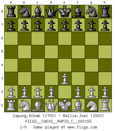 Last move : 1-0 2018 May 9 22:58:35 [Event "FICGS__CHESS__RAPID_C__000155"] [Site "FICGS"] [Date "2018.04.07"] [Round "1"] [White "Capung,Albab"] [Black "Ballie,Joel"] [Result "1-0"] [WhiteElo "1700"] [BlackElo "1500"] 1.e3 1-0 This chess game has been lost on time (started : 2018.04.07 16:35:47) Van't Kruijs Opening Player White won this chess game. Follow this game move after move (download)No one ever won a game by resigning. (Unknown) Es ist nicht das erste mal, dass sich die FIDE dem Arabischen Geld gebeugt hat (über die FIDE WM 2004 in Lybien). (Larry Evans) El Ajedrez es un terrible juego. Si no controlas el centro, tu oponente tiene una posición mas holgada. Si tienes control del centro, ¡entonces realmente tu tienes algo de que preocuparte!. (Siegbert Tarrasch) Les Echecs ne sont pas pour les âmes timides. Ils requièrent un homme entier, qui ne s'arrête pas aveuglément à ce qui a été déjà établi, mais qui tente individuellement de sonder les profondeurs du jeu. (W. Steinitz) Shallow men believe in luck. Strong men belive in cause and effect. (Ralph Waldo Emerson)