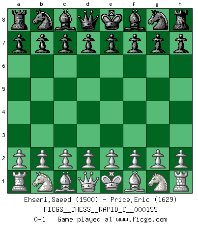 Last move : 0-1 2018 May 3 22:33:23 [Event "FICGS__CHESS__RAPID_C__000155"] [Site "FICGS"] [Date "2018.04.03"] [Round "1"] [White "Ehsani,Saeed"] [Black "Price,Eric"] [Result "0-1"] [WhiteElo "1500"] [BlackElo "1629"] 0-1 This chess game has been lost on time (started : 2018.04.03 15:34:27) Player Black won this chess game. Follow this game move after move (download)There just isn't enough televised Chess. (David Letterman) Du weisst es gibt ein Problem mit Computern und Fernschach, wenn jeder eine Rating von 2450 hat. (John Christen Knudsen) El Ajedrez no es como la vida... ¡tiene reglas!. (Mark Pasternak) C'est une question de caractère, Beaucoup de gens perdent leur motivation très vite. D'autres, ils sont rares, peuvent la conserver très longtemps. J'aime les échecs, encore aujourd'hui je suis heureux d'analyser des parties. J'aime toujours gagner, je déteste encore perdre. Bien jouer est important pour mon intégrité intellectuelle et morale. Et puis les échecs vivent en ce moment une période historique grâce à Internet. Ils se développent dans les systèmes éducatifs à travers le monde. Ils sortent de leur ghetto, et c'est mon rôle de mener à bien cette révolution. (Gary Kasparov) There is no vagueness without wind. (Chinese proverb)