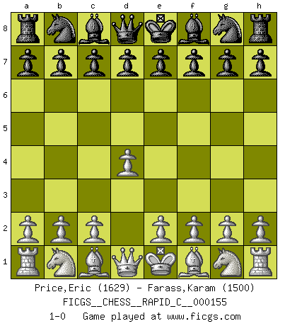 Last move : 1-0 2018 May 7 22:43:4 [Event "FICGS__CHESS__RAPID_C__000155"] [Site "FICGS"] [Date "2018.04.07"] [Round "1"] [White "Price,Eric"] [Black "Farass,Karam"] [Result "1-0"] [WhiteElo "1629"] [BlackElo "1500"] 1.d4 1-0 This chess game has been lost on time (started : 2018.04.07 16:35:44) Queen's pawn Player White won this chess game. Follow this game move after move (download)Every Chess master was once a beginner. (Chernev) Kostenjuk hat keinen Sexappeal. (Loek van Wely) Debió haber existido una vez en que los hombres eran semidióses, de otra manera no hubiesen podido inventar el Ajedrez. (Gustav Schenk) On peut tirer plus d'utilité d'une partie perdue que de 100 parties gagnées. (Capablanca) If only faces could talk... (Pat Summerall, Sportscaster during the Super Bowl)