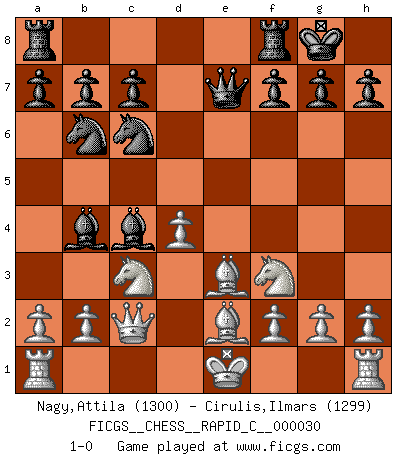 Last move : 1-0 2007 July 29 13:18:2 [Event "FICGS__CHESS__RAPID_C__000030"] [Site "FICGS"] [Date "2007.04.25"] [Round "1"] [White "Nagy,Attila"] [Black "Cirulis,Ilmars"] [Result "1-0"] [WhiteElo "1300"] [BlackElo "1299"] 1.e4 e5 2.d4 exd4 3.c3 d5 4.exd5 Nf6 5.cxd4 Nxd5 6.Nc3 Bb4 7.Bd2 O-O 8.Bc4 Nb6 9.Qb3 Qe7+ 10.Be2 Be6 11.Qc2 Nc6 12.Nf3 Bc4 13.Be3 1-0 This chess game has been lost on time (started : 2007.04.25 13:13:9) Danish gambit : Soerensen defense Kingside Castling by player Black (move 7) Player White won this chess game. Follow this game move after move (download)If I win a tournament, I win it by myself. I do the playing. Nobody helps me. (Bobby Fischer) Wenn ich einen Club besuche, sind die Spieler stumm vor Staunen. (José Raúl Capablanca) Algunos sacrificios son sólidos, los demás son míos. (Mikhail Tal) Il vaut mieux sacrifier les pièces de l'adversaire. (Xavier Tartacover) Depression is just anger without enthusiasm. (Unknown)