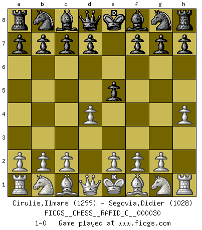 Last move : 1-0 2007 May 27 11:13:45 [Event "FICGS__CHESS__RAPID_C__000030"] [Site "FICGS"] [Date "2007.04.25"] [Round "1"] [White "Cirulis,Ilmars"] [Black "Segovia,Didier"] [Result "1-0"] [WhiteElo "1299"] [BlackElo "1028"] 1.h4 e5 2.d4 1-0 This chess game has been lost on time (started : 2007.04.25 13:13:9) Anti-Borg (Desprez) Opening Player White won this chess game. Follow this game move after move (download)I give 98 percent of my mental energy to Chess. Others give only 2 percent. (Bobby Fischer) Dein Körper muss in Topform sein. Dein Schach verfällt, wenn dein Körper verfällt. Der Körper kann nicht vom Geist getrennt werden. (Robert James Fischer) La belleza de un movimiento no se refleja solo en su apariencia, sino en el pensamiento detrás de él. (Siegbert Tarrasch) Les Echecs mettent en conflit, non pas deux intelligences, mais deux volontés. (Lasker) Cactus - It is depressed cucumber. (Ilmars Cirulis)