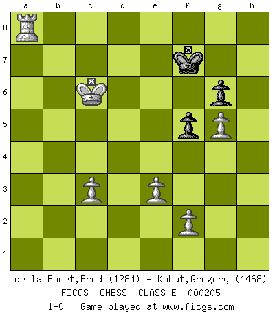 Last move : 1-0 2019 March 30 14:36:30 [Event "FICGS__CHESS__CLASS_E__000205"] [Site "FICGS"] [Date "2018.02.28"] [Round "1"] [White "de la Foret,Fred"] [Black "Kohut,Gregory"] [Result "1-0"] [WhiteElo "1284"] [BlackElo "1468"] 1.d4 Nf6 2.c4 e6 3.Nf3 d5 4.Nc3 c5 5.cxd5 cxd4 6.Qxd4 exd5 7.Bg5 Nc6 8.Bxf6 Nxd4 9.Bxd8 Nc2+ 10.Kd2 Nxa1 11.Bc7 Bb4 12.e3 Nb3+ 13.axb3 O-O 14.Bd3 Be6 15.Ra1 a6 16.Nd4 Rac8 17.Ba5 Bc5 18.Nce2 Bd6 19.Nf5 Bxf5 20.Bxf5 Rb8 21.Bg4 b6 22.Bc3 a5 23.Bxa5 bxa5 24.Kc2 Bb4 25.Nc3 Rbd8 26.Rd1 Bxc3 27.bxc3 Rd6 28.Ra1 Ra8 29.Ra4 Kf8 30.Bf3 Ra7 31.Rd4 Rad7 32.Ra4 Ra6 33.h4 Ke7 34.h5 R6a7 35.Kd3 Ke6 36.Kd4 f5 37.g4 g6 38.hxg6 hxg6 39.g5 Ra6 40.b4 R7d6 41.bxa5 Ra7 42.Be2 Rd8 43.a6 Kd6 44.Rb4 Kc6 45.Bb5+ Kd6 46.Be2 Kc6 47.Bb5+ Kd6 48.Bd3 Kc6 49.Bf1 Rc7 50.Bg2 Ra7 51.Rc4+ Kd7 52.Ra4 Ke6 53.Kc5 R8d7 54.Kb6 Ke7 55.Ra5 Ra8 56.Bxd5 Rd6+ 57.Bc6 Rc8 58.Re5+ Kf7 59.Rc5 Rd2 60.Bd5+ Rxd5 61.Rxc8 Rd2 62.a7 Rb2+ 63.Kc6 Ra2 64.a8Q Rxa8 65.Rxa8 1-0 Queen's pawn game Kingside Castling by player Black (move 13) Promotion Queen by player White (move 64) 10 pieces endgame at move 64 : White KRPPPP , Black KRPP WHITE : King + 1 Rook 4 Pawns BLACK : King + 1 Rook 2 Pawns 9 pieces endgame at move 65 : White KRPPPP , Black KPP WHITE : King + 1 Rook 4 Pawns BLACK : King + 2 Pawns Player White won this chess game. Follow this game move after move (download)When your house is on fire, you can't be bothered with the neighbors. Or, as we say in Chess, if your King is under attack you don't worry about losing a Pawn on the Queen's side. (Gary Kasparov) Wenn du auf das Glück wartest, wird das Leben ziemlich langweilig. (Mikhail Nekhemyevich Tal) Cuando tengas duda... ¡juega al Ajedrez!. (Tevis) Toute estimation doit être constamment réévaluée. (Jacob Estrin) A good teacher is like a candle - it consumes itself to light the way for others. (Author unknown)