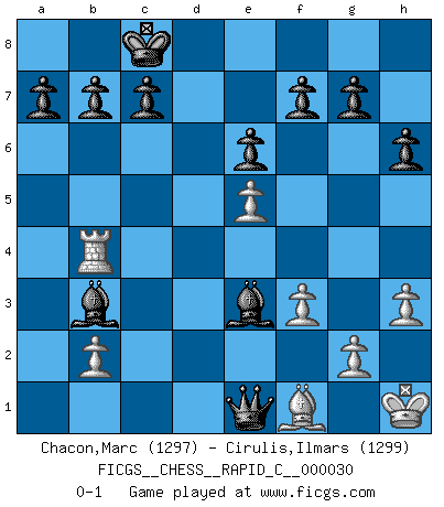 Last move : 0-1 2007 July 26 13:25:31 [Event "FICGS__CHESS__RAPID_C__000030"] [Site "FICGS"] [Date "2007.04.25"] [Round "1"] [White "Chacon,Marc"] [Black "Cirulis,Ilmars"] [Result "0-1"] [WhiteElo "1297"] [BlackElo "1299"] 1.d4 d5 2.c4 e6 3.Nf3 Nf6 4.Bg5 Nc6 5.Nc3 Bb4 6.e3 h6 7.Bxf6 Qxf6 8.Be2 Bd7 9.O-O dxc4 10.Bxc4 O-O-O 11.Qb3 Qg6 12.Ne5 Nxe5 13.dxe5 Bc6 14.f3 Bc5 15.Bb5 Rd2 16.Be2 Bxe3+ 17.Kh1 Bd4 18.Rad1 Bxc3 19.Rxd2 Bxd2 20.Rd1 Rd8 21.h3 Qg3 22.a4 Rd4 23.Bf1 Bf4 24.Kg1 Bxa4 25.Rxd4 Bxb3 26.Rb4 Be3+ 27.Kh1 Qe1 0-1 QGD Kingside Castling by player White (move 9) Queenside Castling by player Black (move 10) Player Black won this chess game. Follow this game move after move (download)Chess is ruthless: you've got to be prepared to kill people. (Nigel Short) Nicht daß Diemer aus Opportunismus Mitglied der NSDAP geworden wäre. Er war ein Fanatiker, in allem, was er tat. (Hans Ree) En la vida, como en el Ajedrez, los Peones propios obstruyen nuestro camino. La gran fortuna de un hombre, su comodidad, placer, hijos, libros, que deberían ayudarle a ganar, con mucha frecuencia lo ponen en Jaque Mate. (Charles Buxton) Les échecs sont un jeu terrible. Si vous n'avez pas le centre, votre adversaire a une position plus libre. Par contre, si vous avez le centre, alors vous avez vraiment quelque chose pour laquelle vous inquiéter ! (Siegbert Tarrasch) Every vice is only an exaggeration of a necessary and virtuous function. (Ralph Waldo Emerson, Journals 1936)